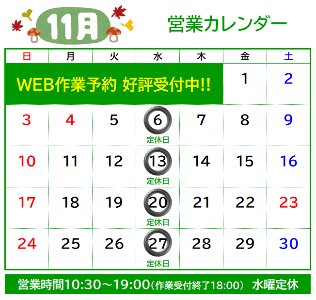 11月 定休日のご案内 ポスト 2024年11月1日 いつも タイヤ館上田 をご利用いただきありがとうございます。 11月になり最低気温が1ケタ前半の予報も増えてきました。 タイヤ交換のご予約はお早めに! 11月の営業案内です。 毎週 水曜日が定休日となります。 ご不便をおかけしますが、ご理解の程、お願いいたします。 また、WEB予約サービスでは営業時間外、定休日でも ご予約いただけますので、ご利用ください。