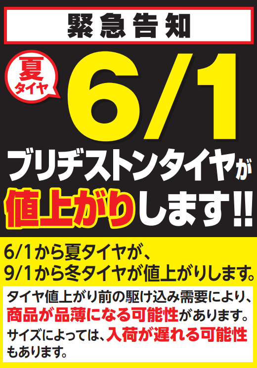 冬タイヤは9/1(月)より、値上げとなります。