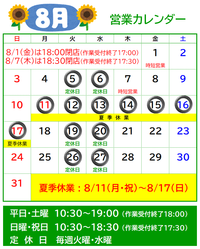 8月定休と夏季休業のご案内 ポスト 2025年7月31日 いつもタイヤ館上田をご利用いただきありがとうございます。 8月1日(金)と7日(木)は時短営業となります。 また、8月11日(月)から17日(日)は夏季休業で店休となります。 ご来店の際はお気をつけてお越しくださいませ。 カテゴリ:お知らせ 担当:石沢