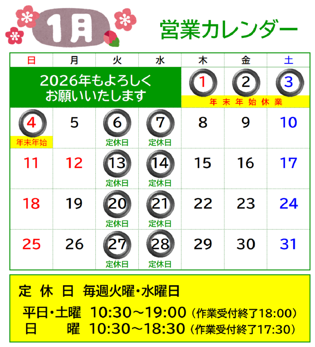 年末年始休業と1月営業日のご案内 ポスト 2025年12月27日 いつもタイヤ館をご利用いただきありがとうございます。 12月28日(日)から1月4日(日) は年末年始休業のため、店休となります。 また、1月からは火曜日・水曜日が定休日となります。 ご来店の際はお気をつけてお越しくださいませ。 カテゴリ:お知らせ 担当:石沢