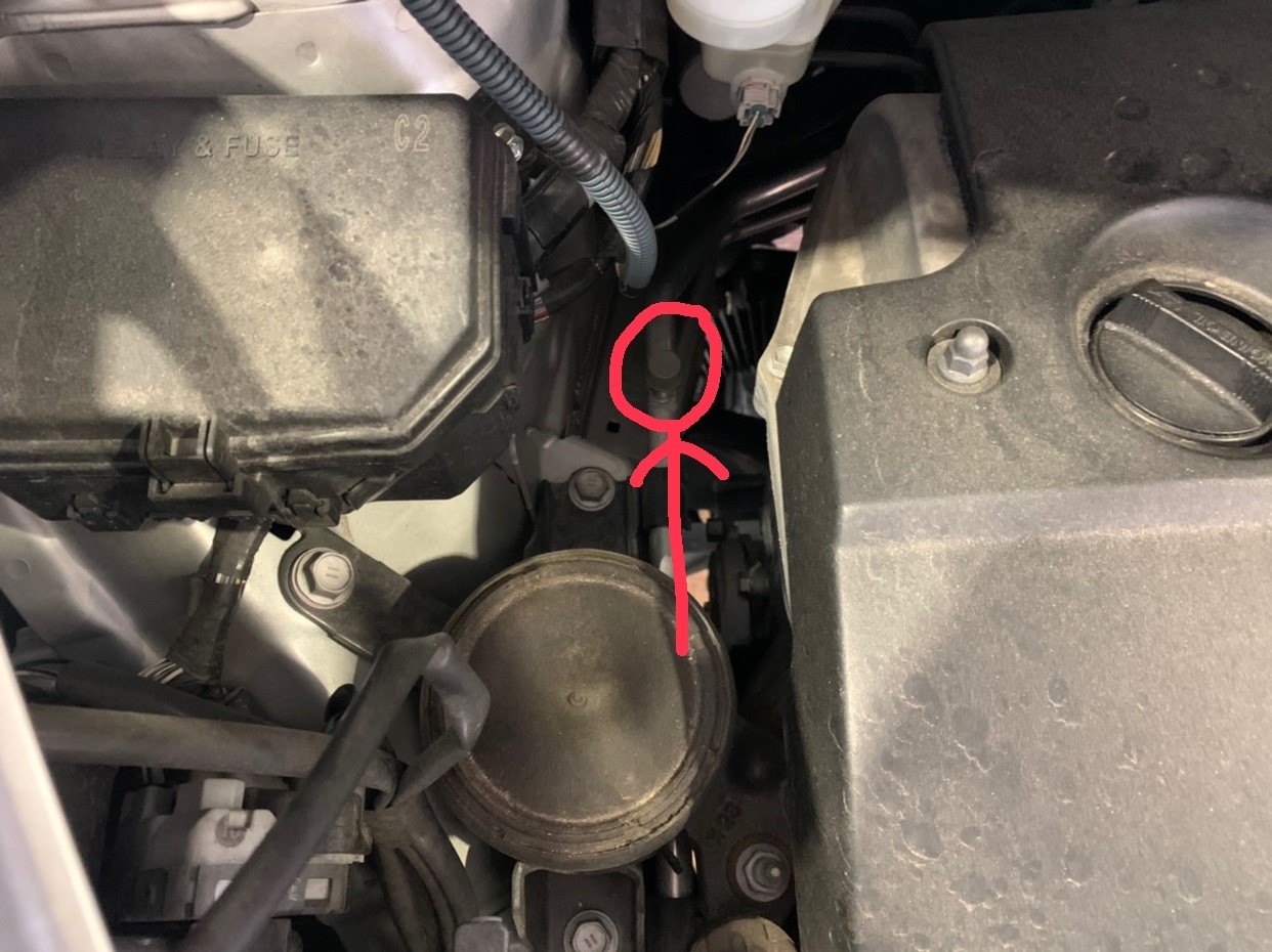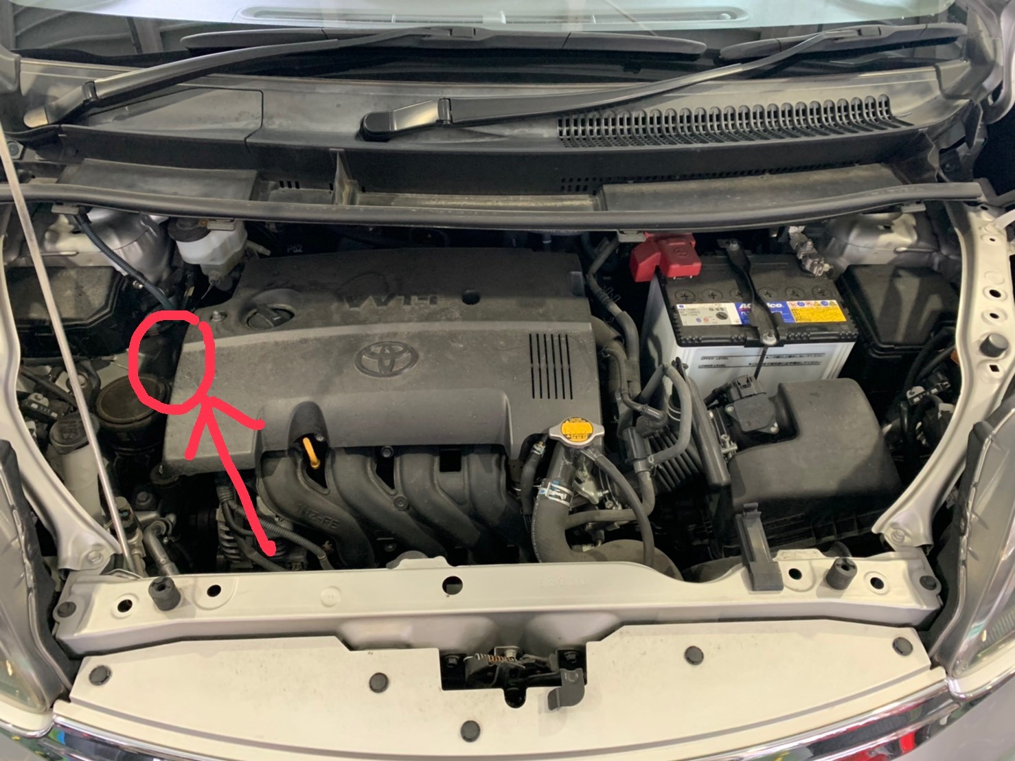 今回施工したポルテは、エンジンの左側の矢印の先の下の方についていました。