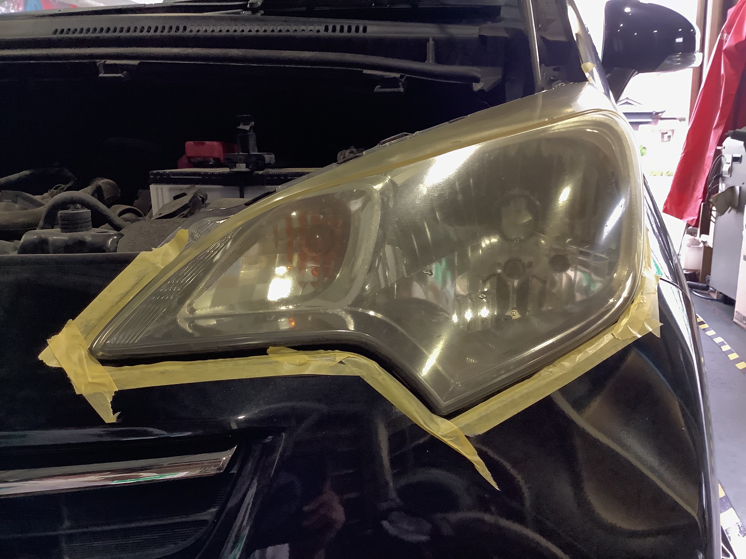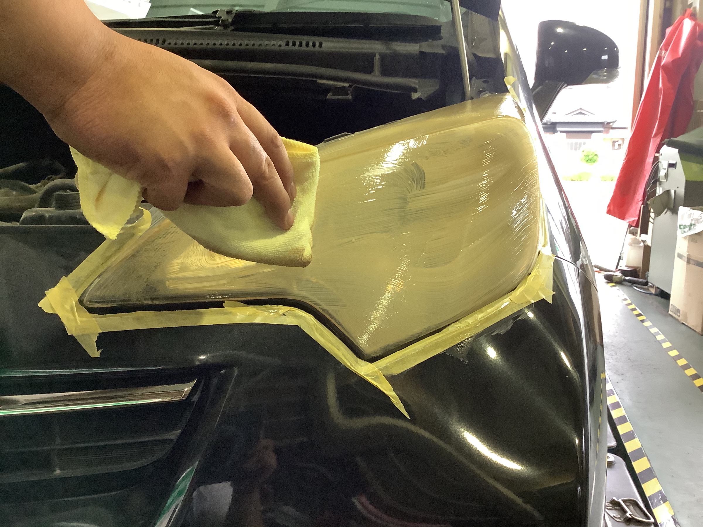 まずはマスキングをして車体に溶剤がつかないように、丁寧にマスキングをしていきます。