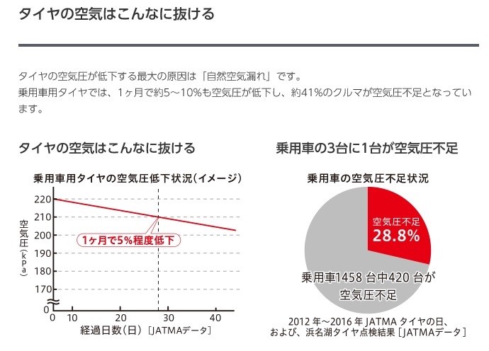 そのため、知らないうちに空気圧が低下したまま走行しているという事が多く発生しています。