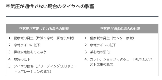この中でも空気圧が不足している場合の影響として偏摩耗の発生、摩耗ライフの低下は簡単にいうと、