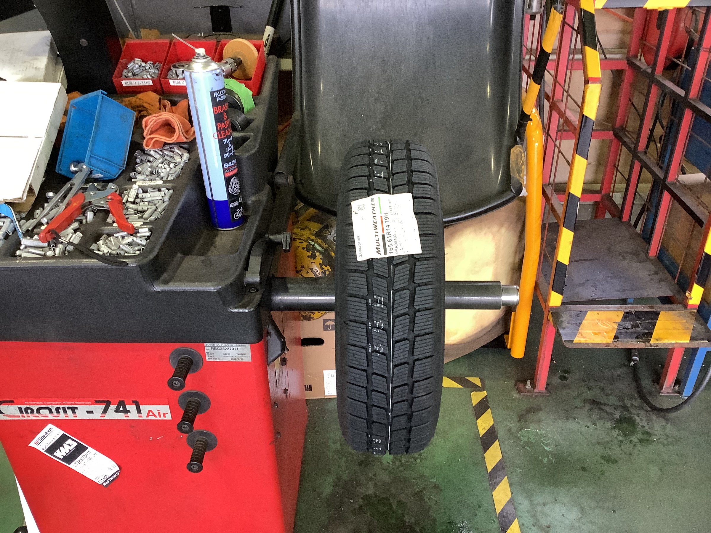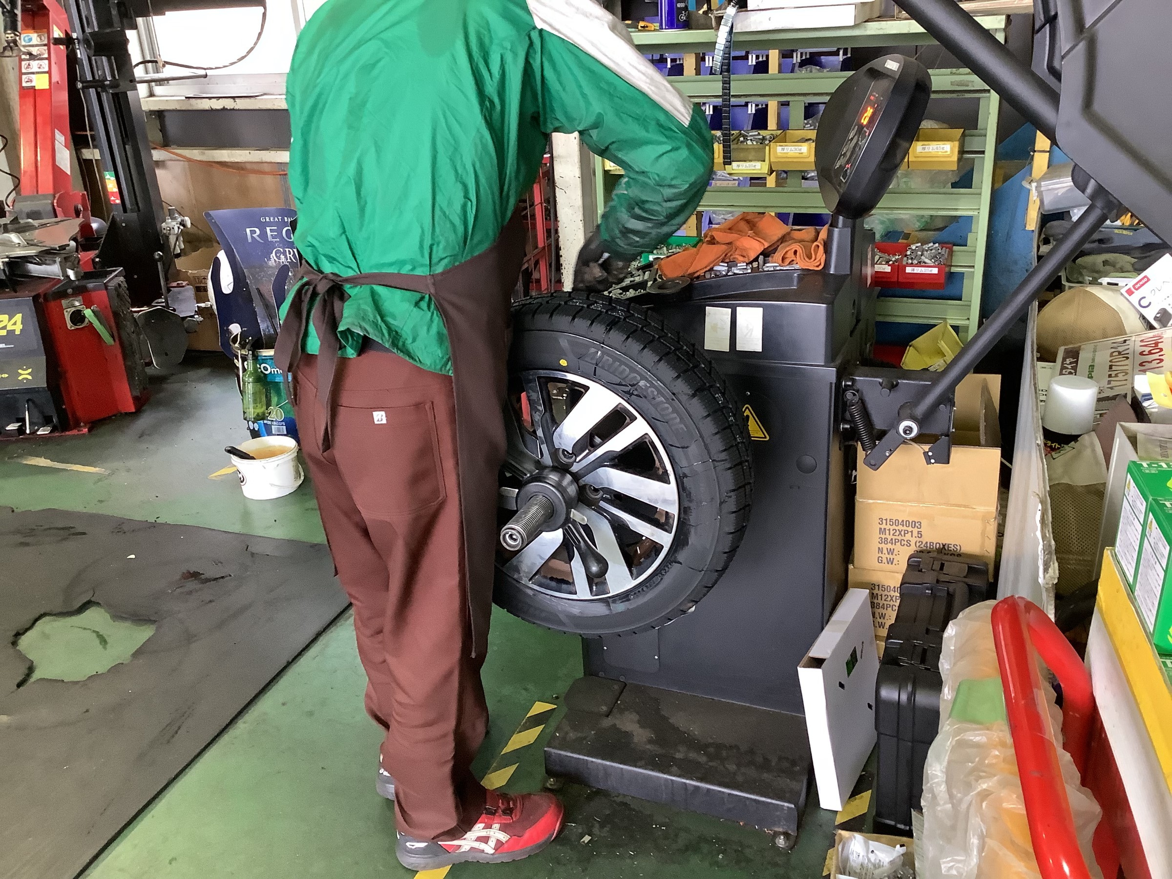 組み終わりましたら、タイヤホイールのバランスを取るために専用の機械で回していきます。