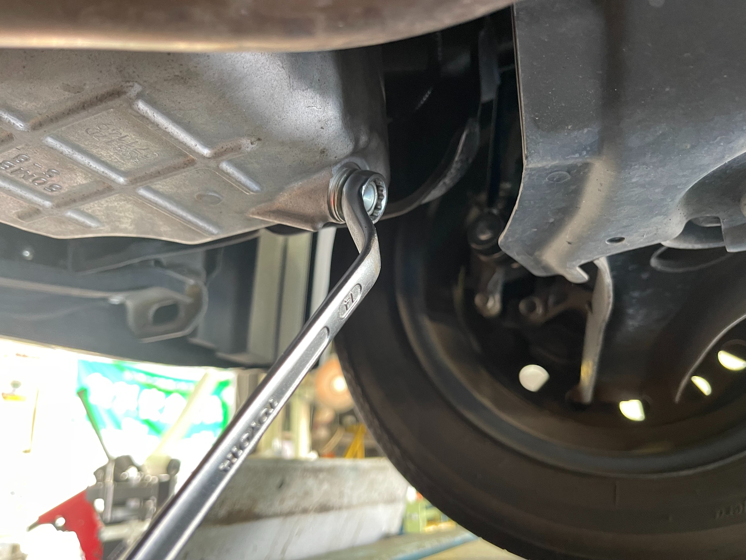 オイルパンのドレンボルトを工具を使って