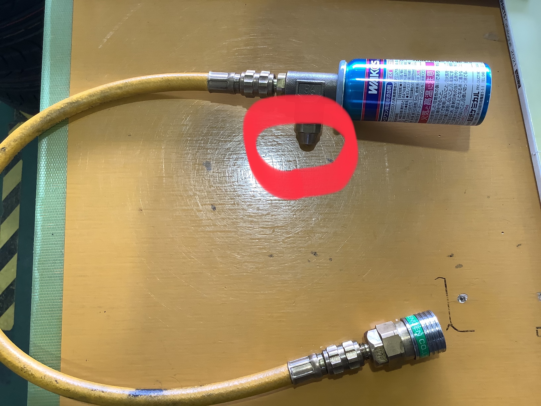 エアコンの配管のLow側のバルブにホースをつけます!
