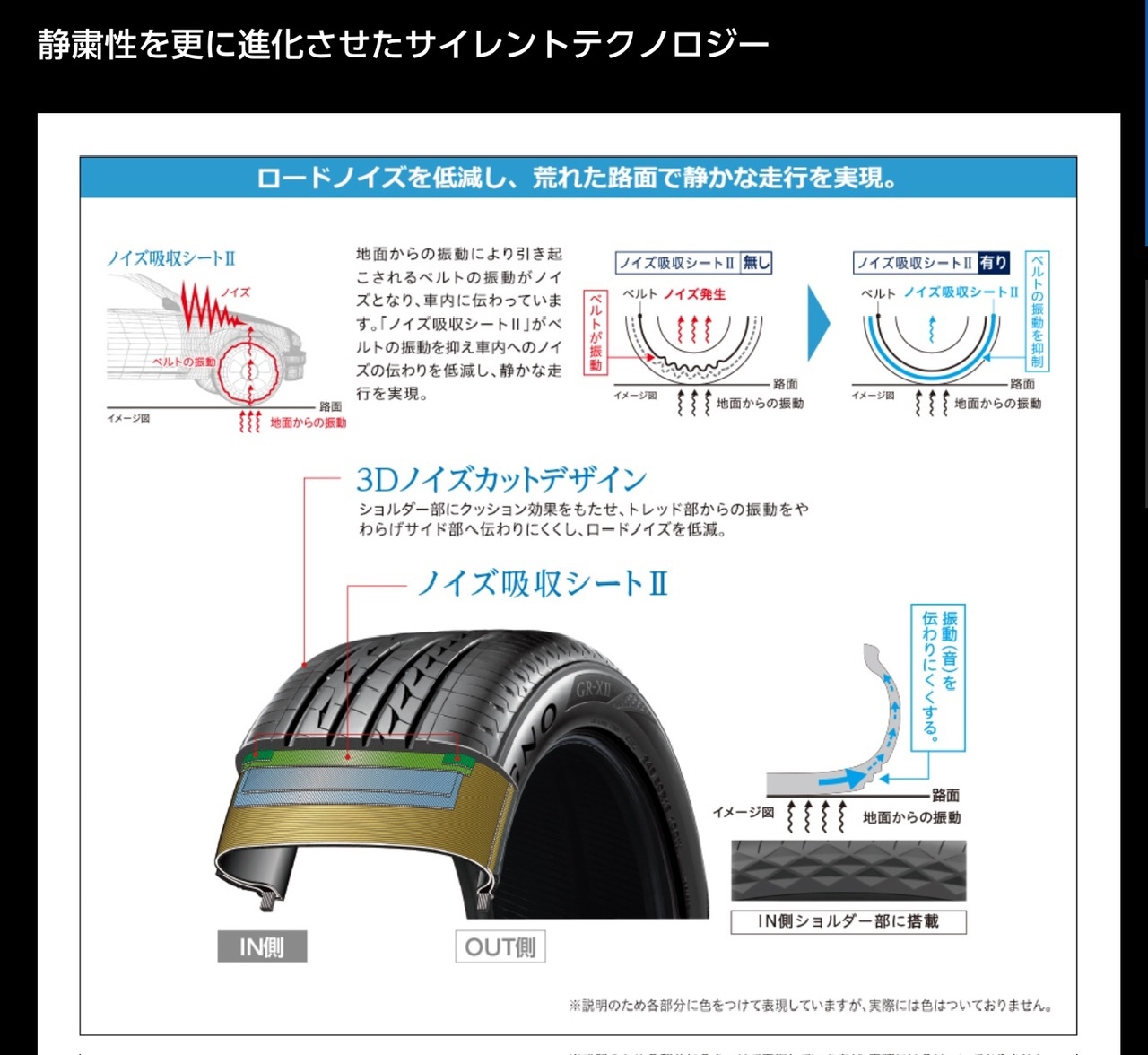 地面からの振動により引き起こされるベルトの振動がノイズとなり車内に伝わっていきますが、それらを抑え車内のへのノイズの伝わりを低減しています。また、荒れた路面における静かな走行をさらに進化させます。
