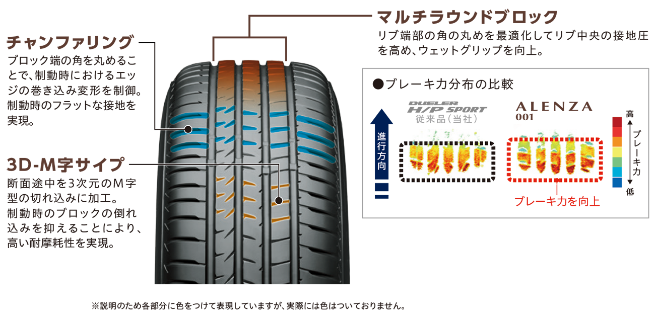 スポーティな運動性能を高次元で引き出すために、タイヤ骨格部分を重構造(ベルト補強材やベルト端補強材などを採用)とすることで、高剛性を保ち、高いドライ性能を実現しています。 加えてパタンについては、リブ端部の角の丸めを最適化して中央の接地性を高める「マルチラウンドブロック」を採用することでウェットグリップを向上。また、ブロック端の角を丸め、制動時におけるエッジの巻き込み変形を制御する「チャンファリング」により制動時のフラットな接地を実現し、高い制動性能を確保しています。さらにパタンには、断面途中を3次元のM字型の切れ込みに加工した「3D-M字サイプ」を採用することで、制動時のブロックの倒れこみを抑え、高い耐摩耗性を実現しています。