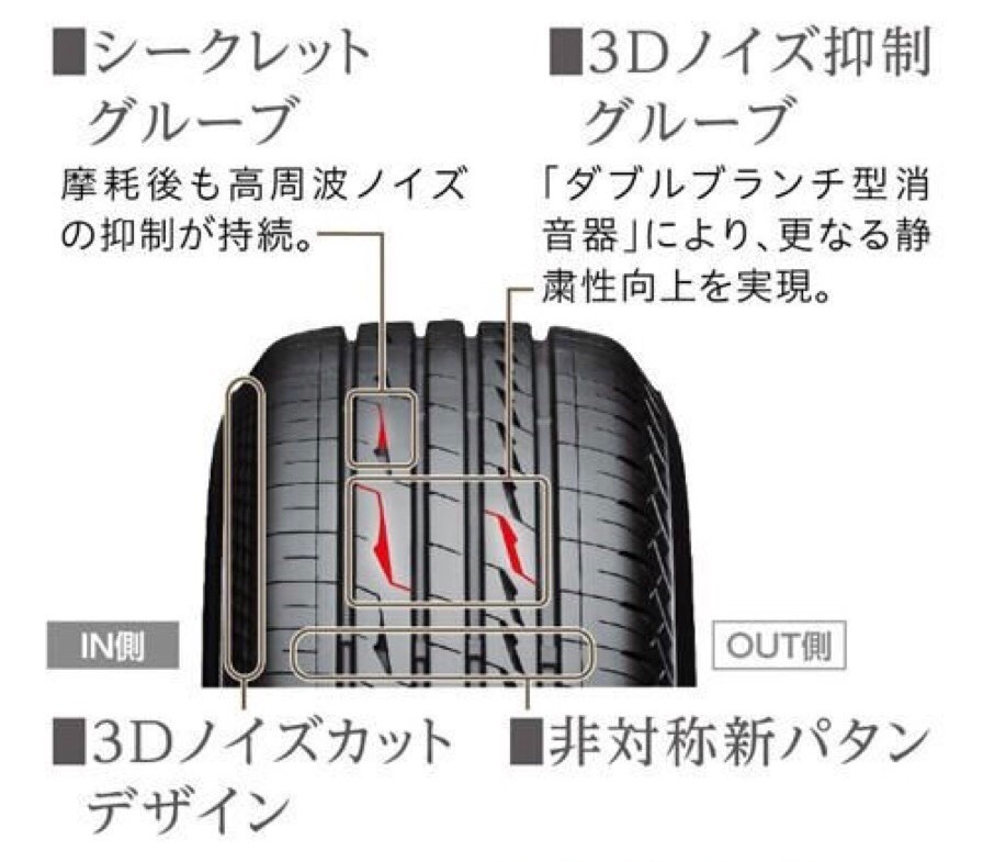 LX100には、ブリヂストンの中で静かさや乗り心地の良いタイヤとして快適性の頂点に君臨するタイヤ「REGNO(レグノ)」と同じ「シークレットグルーブ」・「3Dノイズ抑制グルーブ」という技術が採用されています。そのタイヤと同じ技術を使っているということは、「ALENZA LX100」は快適性を追求したタイヤということが言えると思います