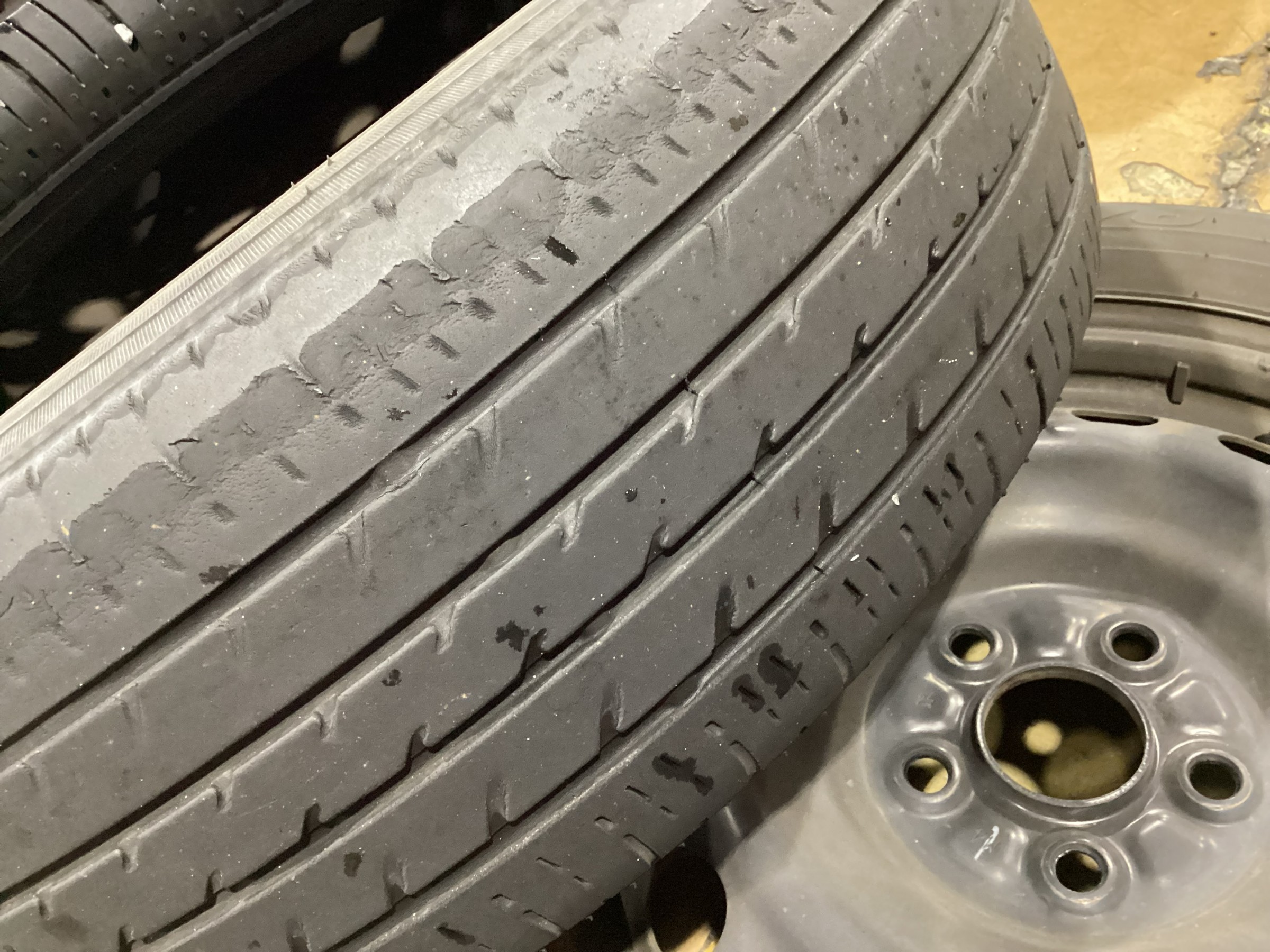 タイヤ交換前のタイヤを見ていただき、外側が極端に減っていて片べりしていてアライメントと長持ちプランに入っていただきました(*'▽')