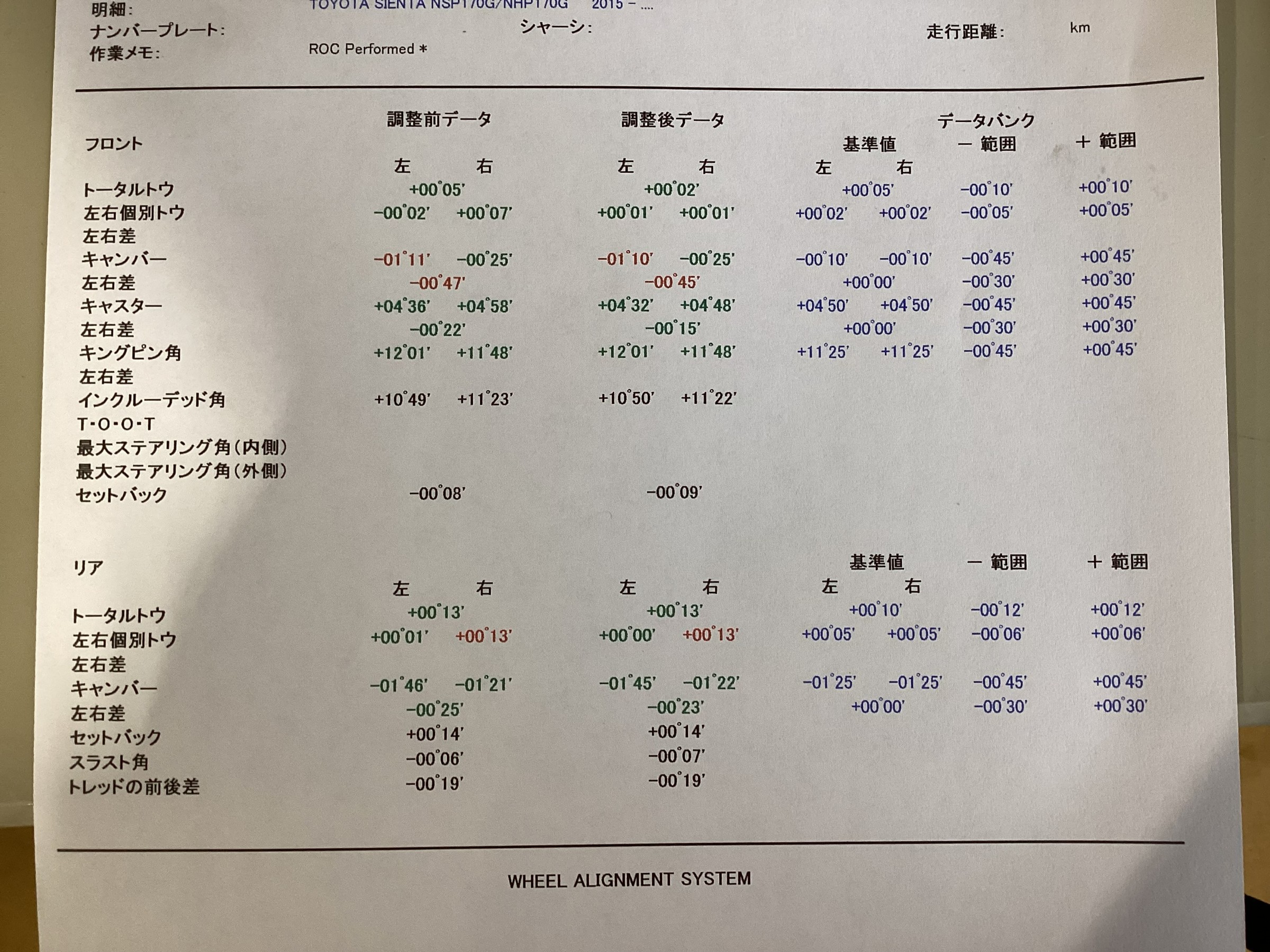 TOYOTA シエンタ GR-XⅡ タイヤアライメント調整