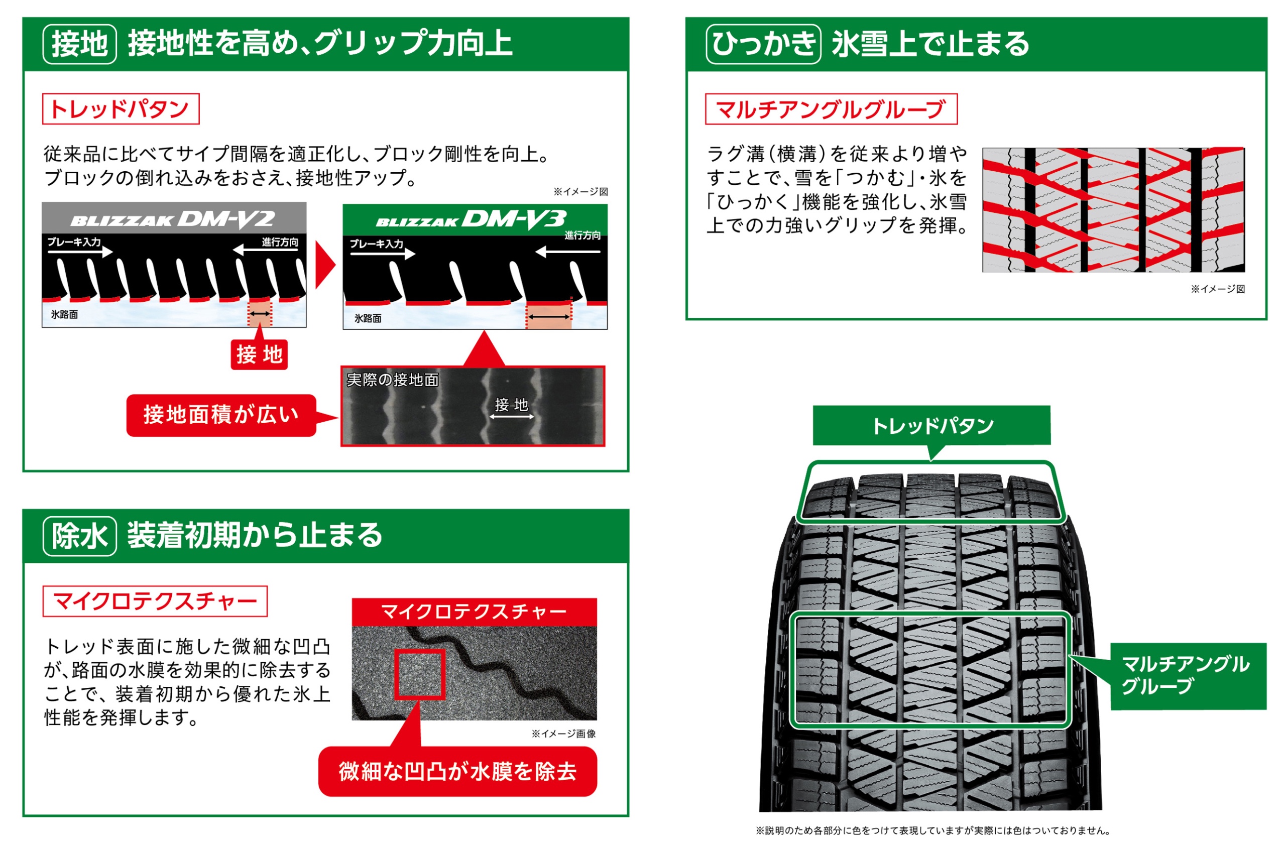 「BLIZZAK DM-V3(ブリザック ディーエム ブイスリー)」は、ブリザック史上最高性能を誇るVRX2にも採用されている「アクティブ発泡ゴム2」を搭載し、グリップ力を従来品に比べ大幅に向上しました。