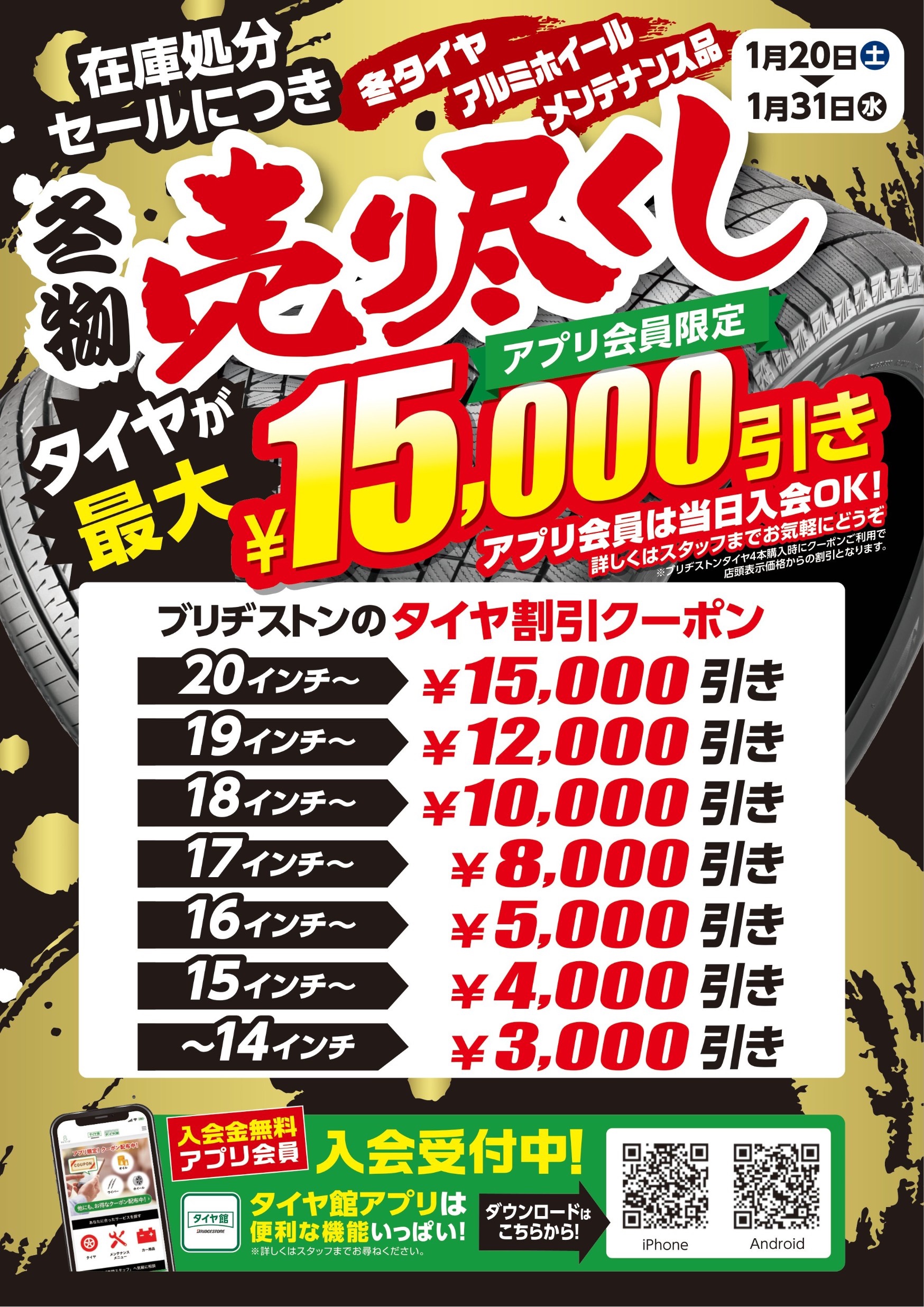 まだまだ活躍する時期のスタッドレスタイヤ、今が買い時!当日加入OKのタイヤ館アプリに登録すると、『ブリヂストンタイヤが4本最大15,000円引き』になります!