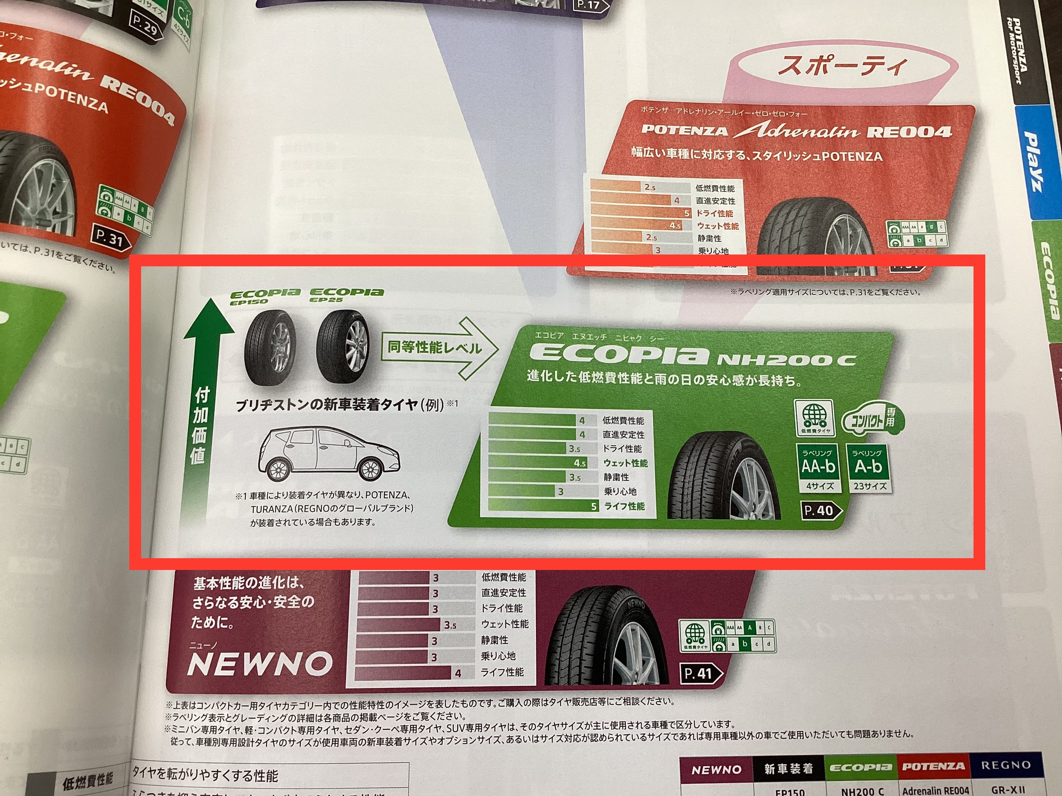 ▼新車装着タイヤ「ECOPIA EP150」同等性能レベルは、「ECOPIA NH200C」とブリヂストンのタイヤカタログにも掲載されています。(2024年ブリヂストンタイヤカタログ P.12)