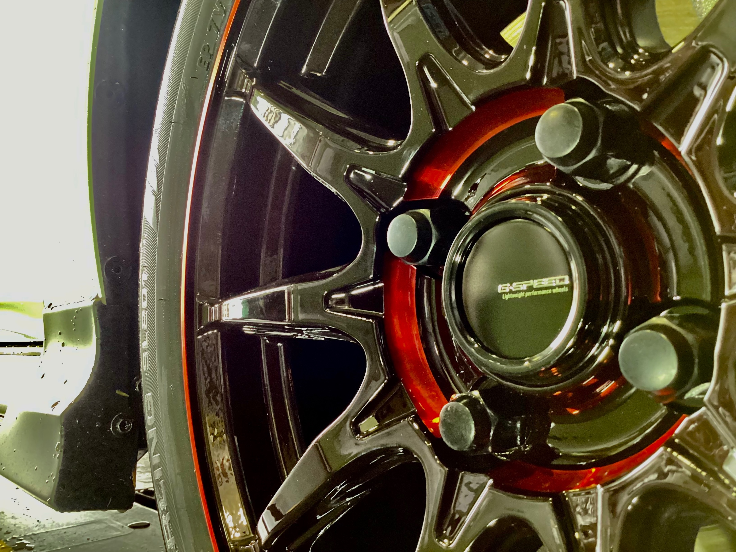 赤いラインの入った軽量ブラックカラーホイールです。今回のヤリスに元々入るエアロのレッドラインに相まって「赤」が映えるヤリスに仕上がりました。