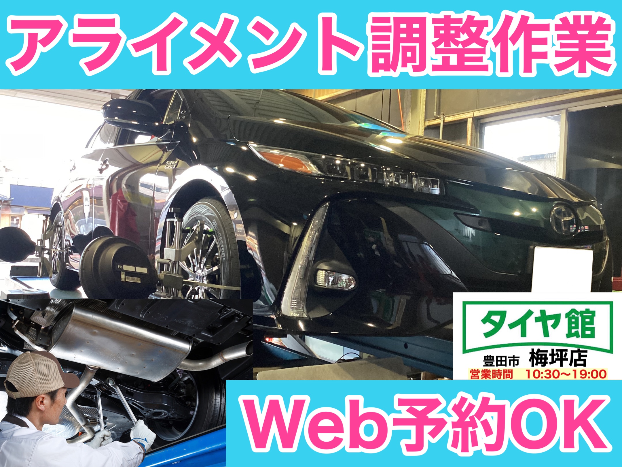 タイヤ館梅坪店では、アライメント調整作業のWeb予約を受付中です。ご利用ください。