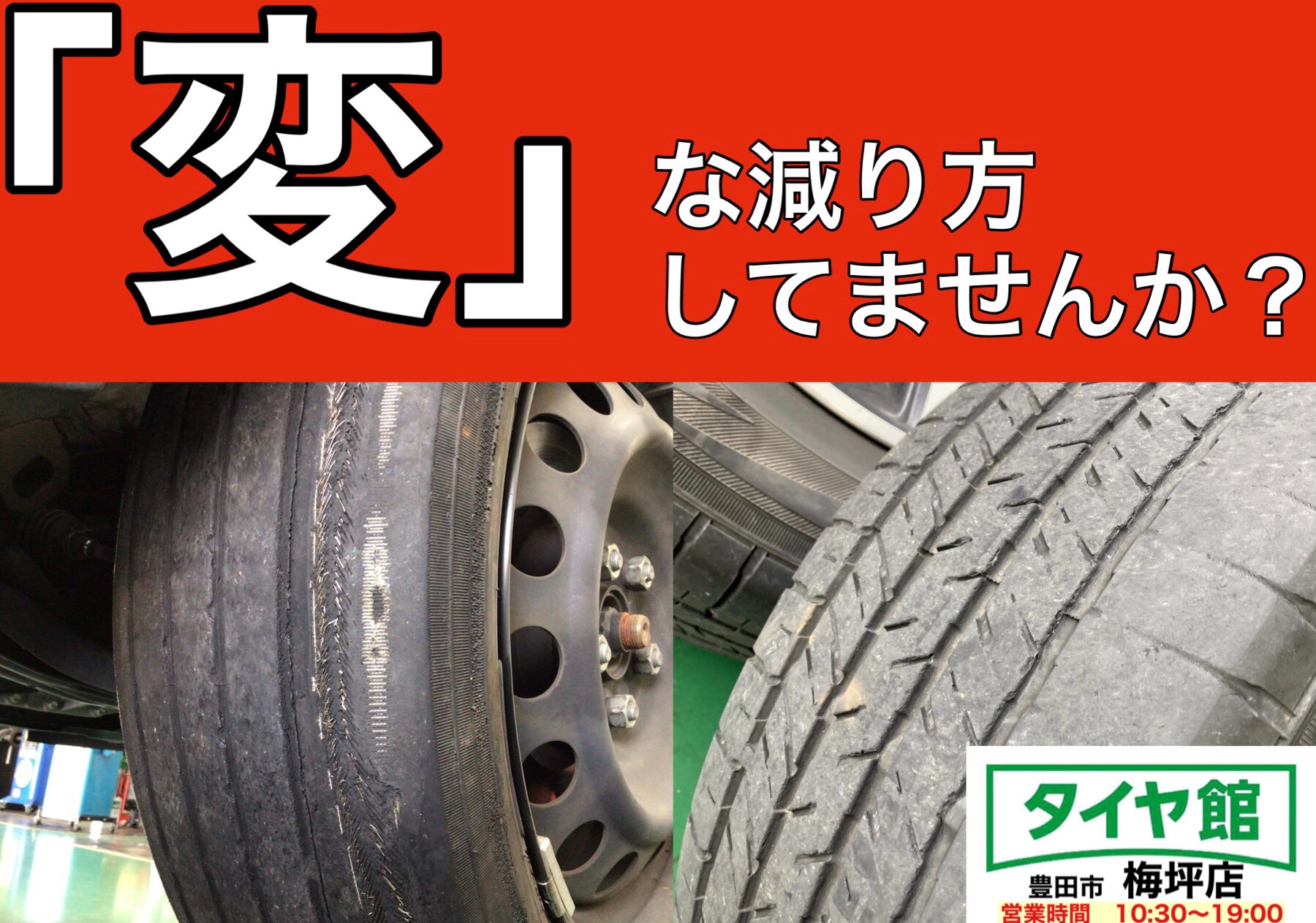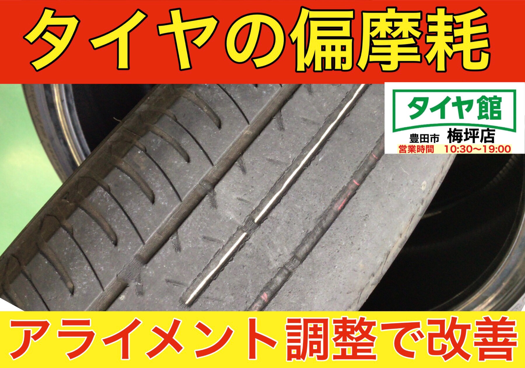 もし、偏摩耗している場合、新品タイヤに交換しても偏摩耗は解消されません。「アライメント調整作業」でタイヤの角度を正常値に戻さなければなりません。ご自身のクルマ、もしかしたら…と思ったり、どうなんだろう、不安だなぁ…と感じたらタイヤ館梅坪店にお気軽にご相談ください。