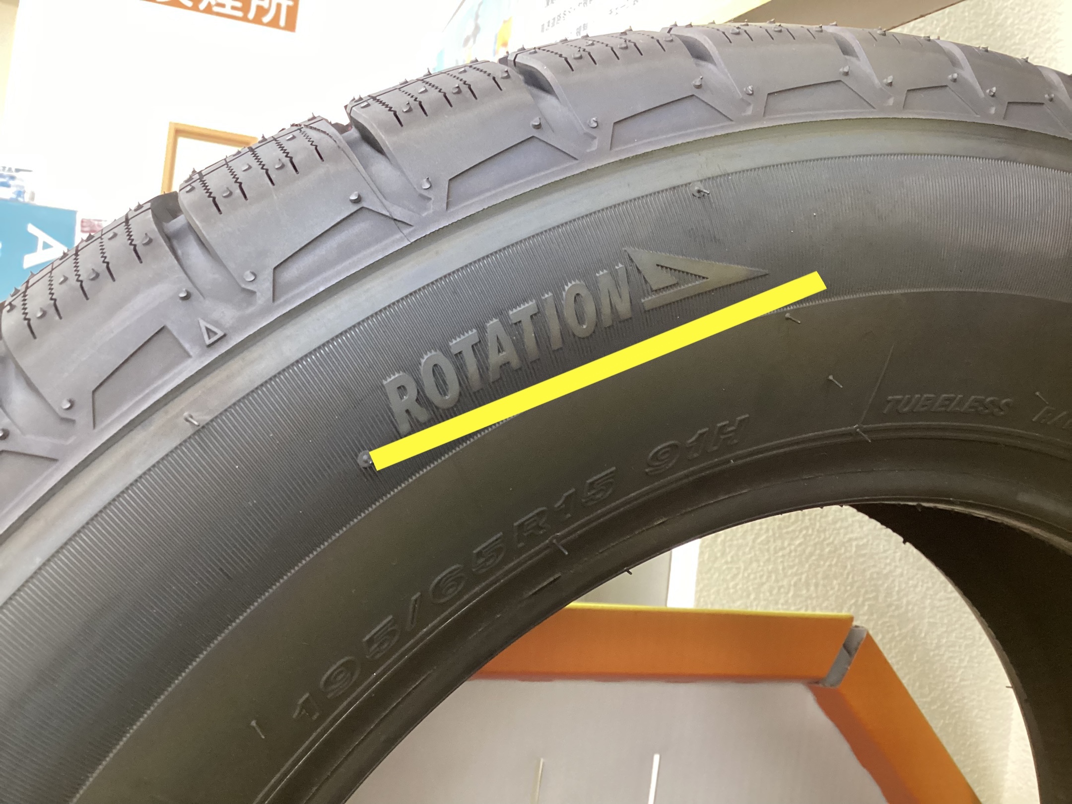 「ROTATION▶︎」という刻印がありますが、これはタイヤの回転方向「ローテーション」を示しています。この印があると、決められた回転方向でしか性能を発揮できません。逆回転での誤装着にはご注意ください。