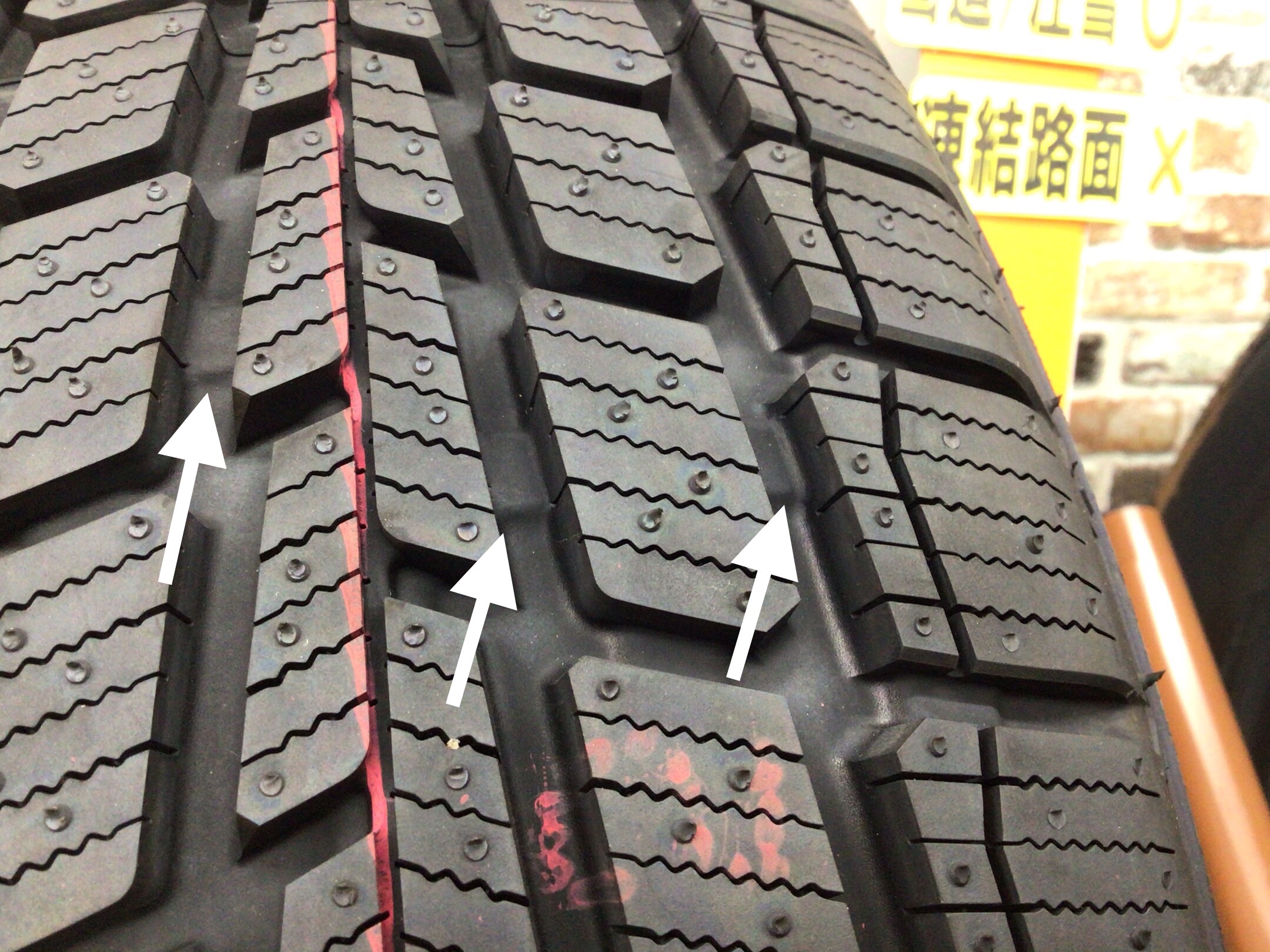 びっしりと細かくタイヤに波状の切れ目が入っていますがこれが雪道で効くポイントとなります。このギザギザ(サイプ)が雪をひっかき滑りにくくします。(エッジ効果)