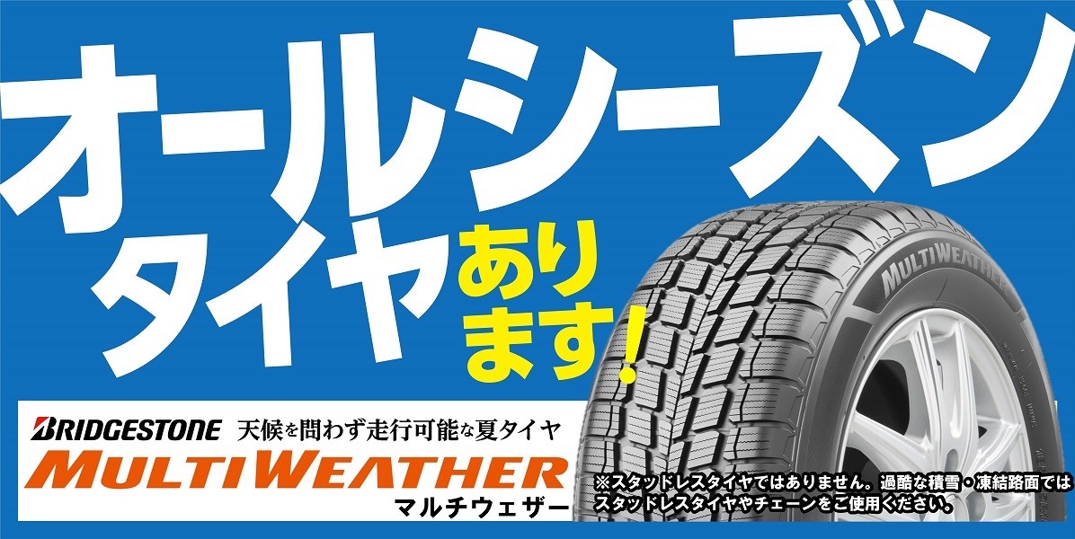近年まで冬の走行にはスタッドレスタイヤ。この一択でした。しかし、最近ではオールシーズンタイヤというものが注目を浴び始め、ブリヂストンタイヤでは、現在、限られた店舗にて乗用車用オールシーズンタイヤ「マルチウェザー」を発売しており、タイヤ館梅坪店でも取り扱っています。