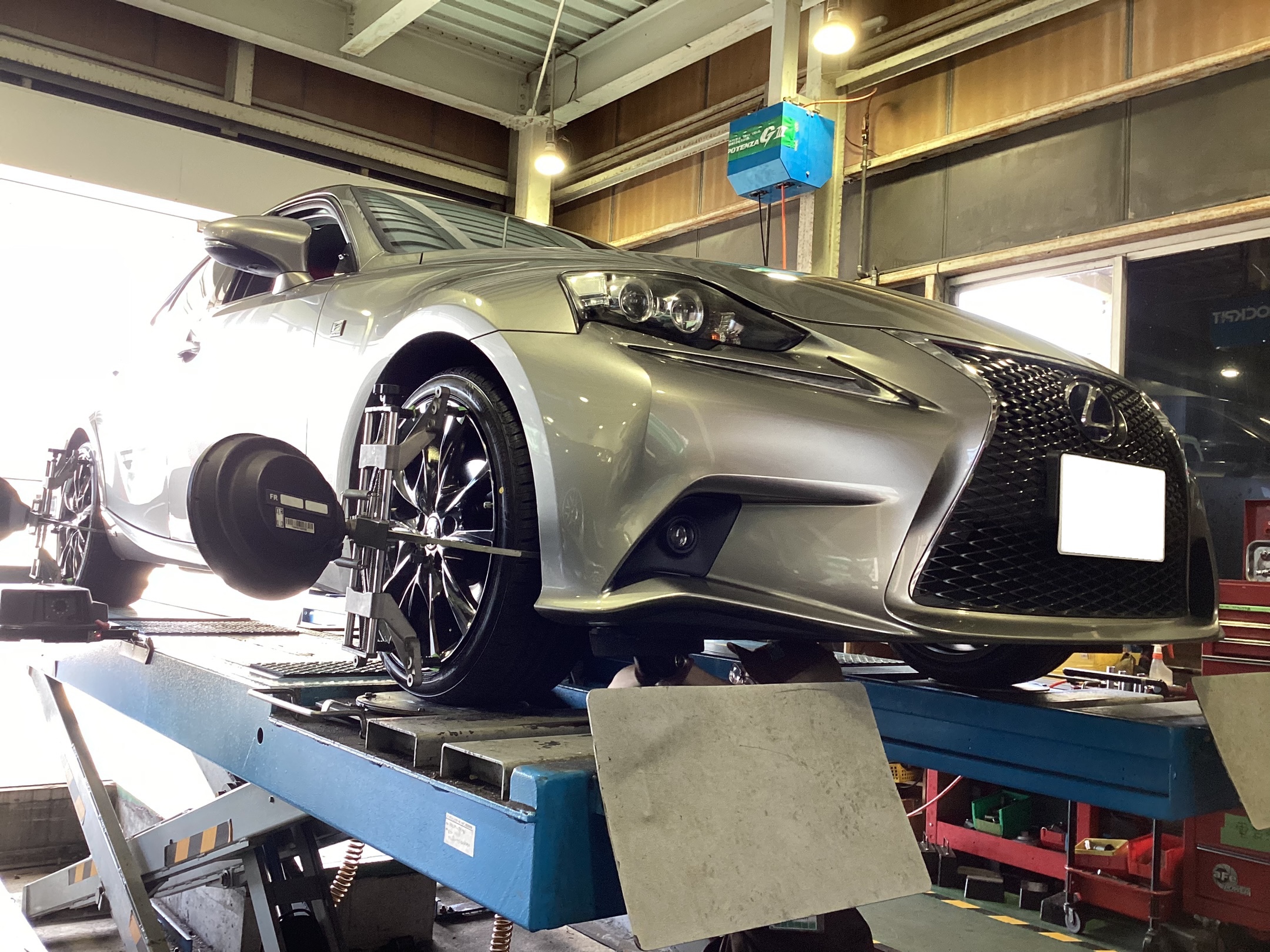 ISのタイヤ・ホイールにセンサーを取り付け、タイヤの取付角度のミリ単位の数値を測ります。その数値が自動車メーカーが定める数値と比較して正常値が異常値かをチェックします。