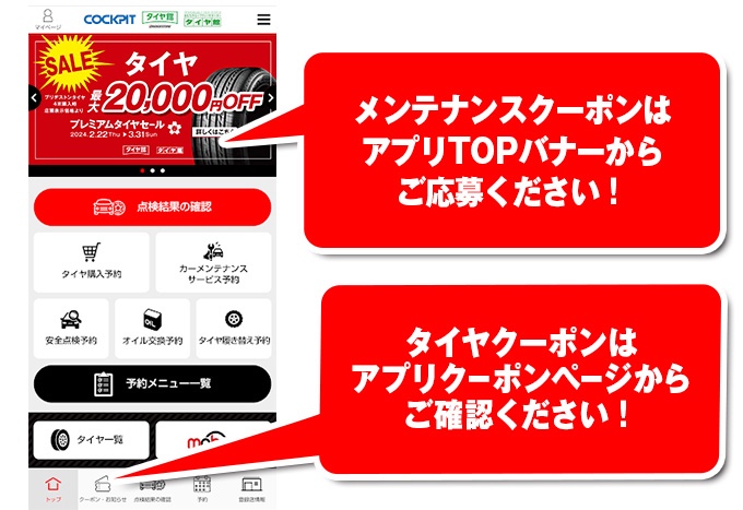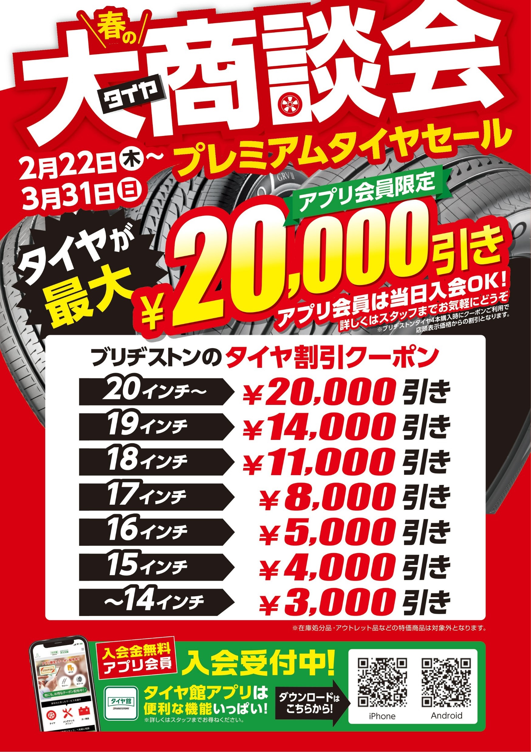 タイヤ館アプリはダウンロードしていただきましたでしょうか?現在開催中の「大商談会 プレミアムタイヤセール」の【ブリヂストンタイヤ4本最大20,000円】キャンペーンは、タイヤ館アプリ内のクーポンご利用が条件となっています。