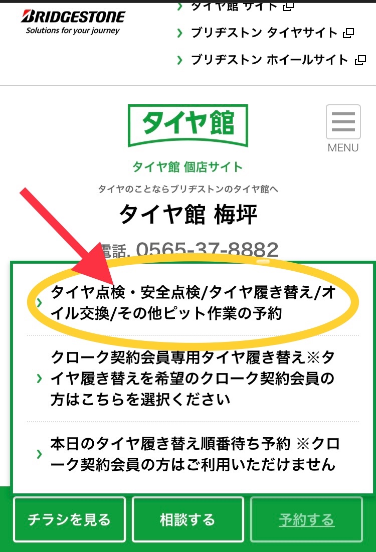 ▼タイヤ館梅坪店のホームページの「予約する」をタップ