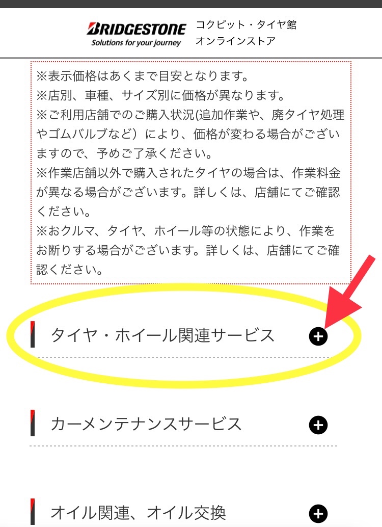 ▼「タイヤ・ホイール関連サービス」の[➕]をタップ