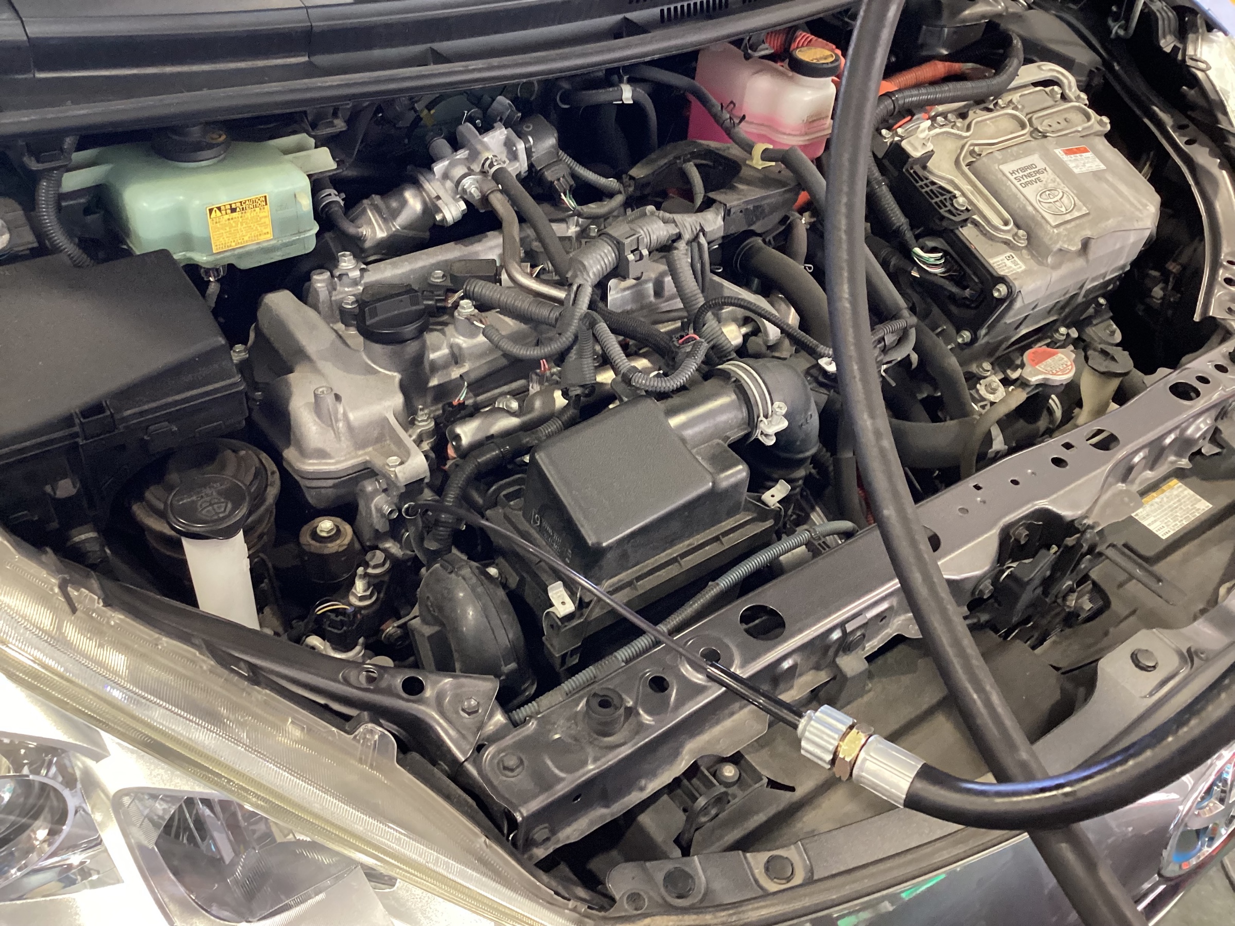オイルパンの底に溜まっているオイルまで根こそぎ抜き取れるオイル上抜き機を使用してクルマをリフトで上げずにオイル交換を実施。