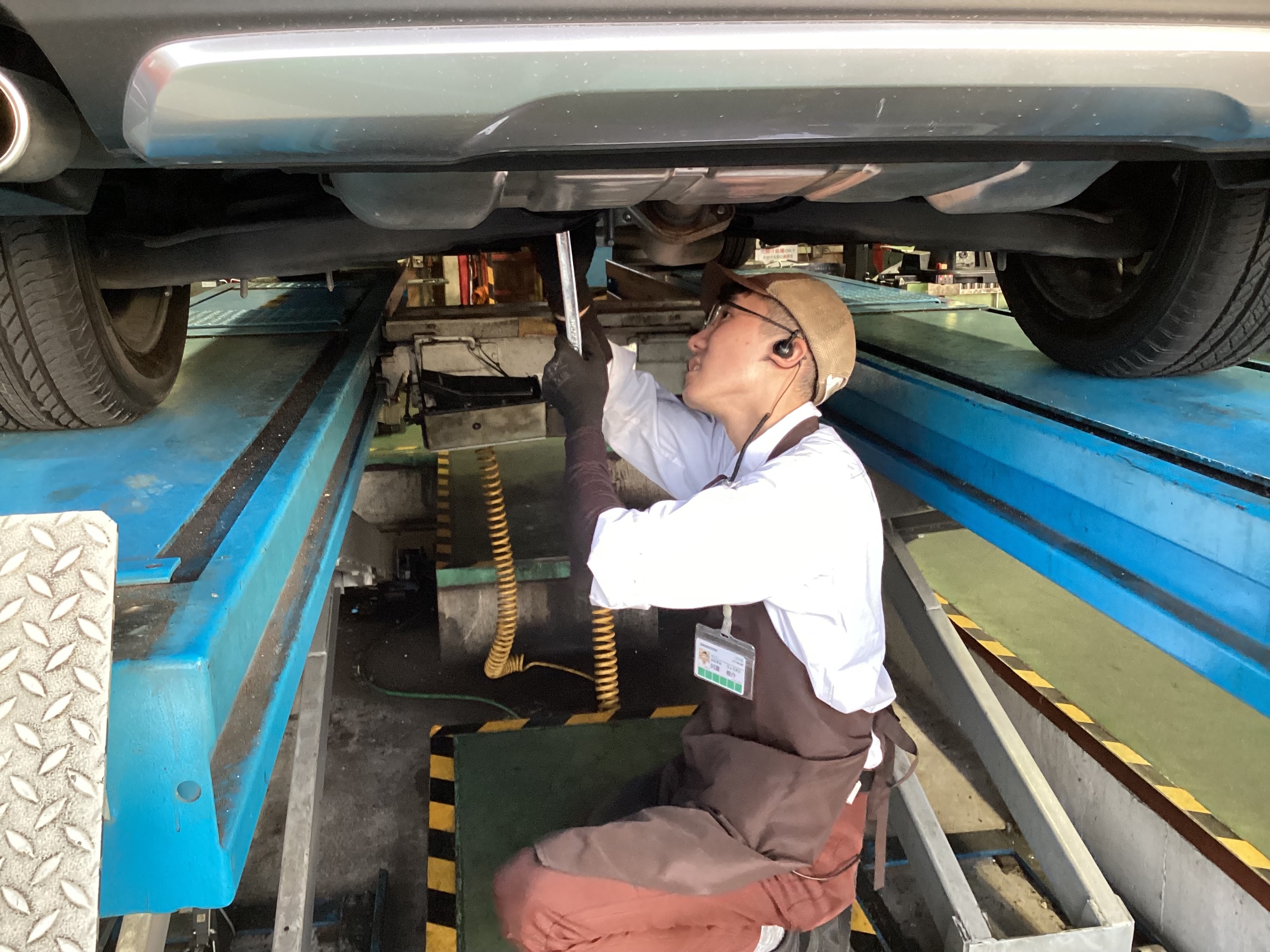測定の結果、数値にズレがありましたので、熟練スタッフがクルマの下に潜り、最適な数値に戻す調整作業をします。