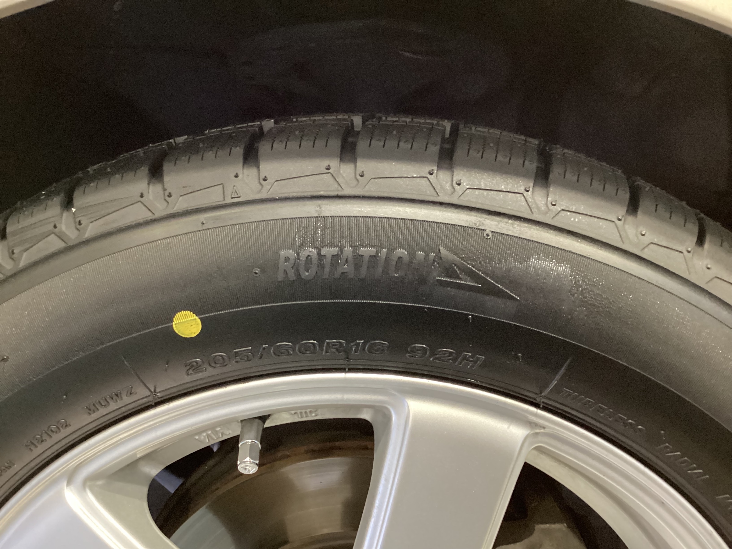 「ROTATION➡︎」の印は、タイヤに回転する方向が決められていることを知らせます。マルチウェザーは、全て回転方向が決められているので、ホイールに組み込むと、タイヤの位置替えのローテーションは右は右前後のみ、左も左のみとなります。