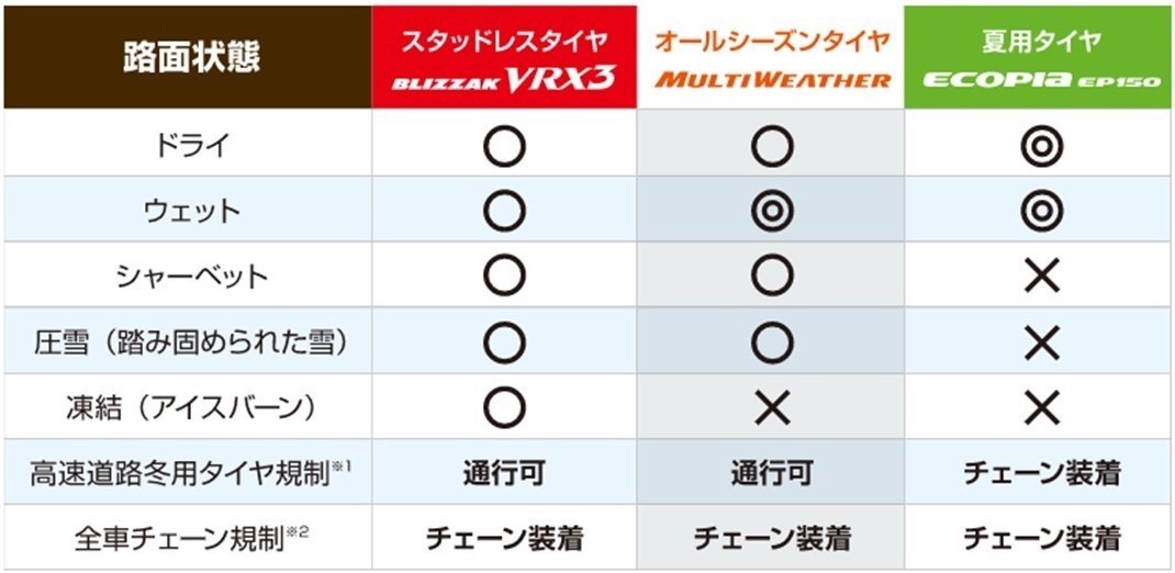 あくまで夏タイヤの延長線上にあるタイヤとしての位置付けで、タイヤのゴムのコンパウンドは夏タイヤであってスタッドレスタイヤとは全く異なります。