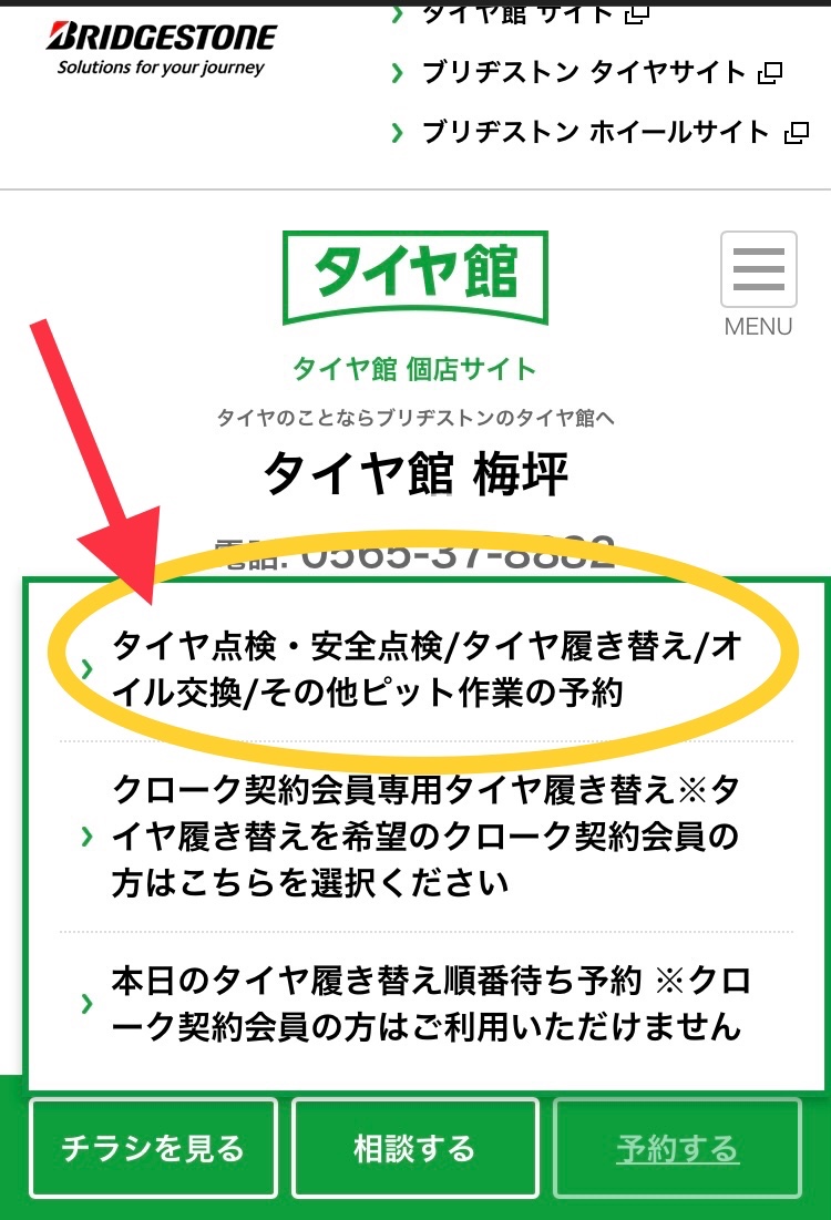 ▼ タイヤ館梅坪店ホームページ内の「予約する」をタップ