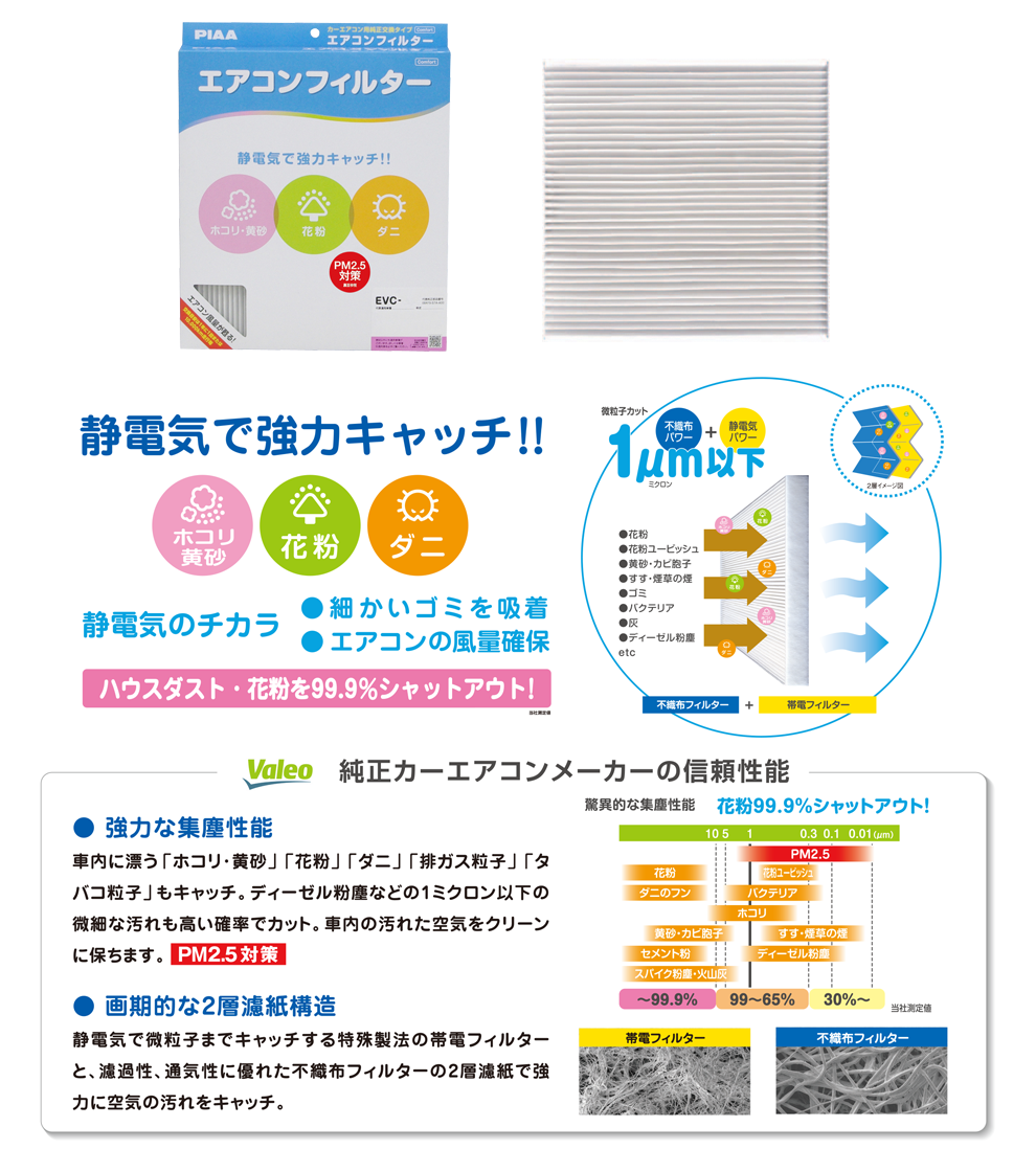 今回交換したエアコンフィルターは、ホコリ、黄砂、ダニ、花粉、PM2.5の対策のされた非常に目が細かい『PIAA コンフォート』です。