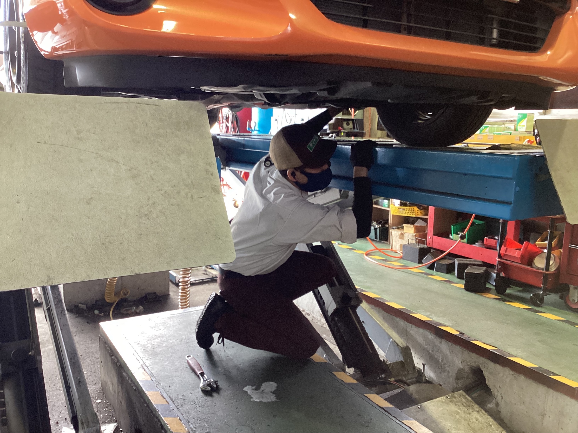 ズレがあった場合、タイヤの早期摩耗や偏摩耗、走行の安定さが欠けたりします。それを緩和するのがアライメント調整作業。熟練スタッフがクルマの下に潜り、最適な数値に戻す調整作業をします。