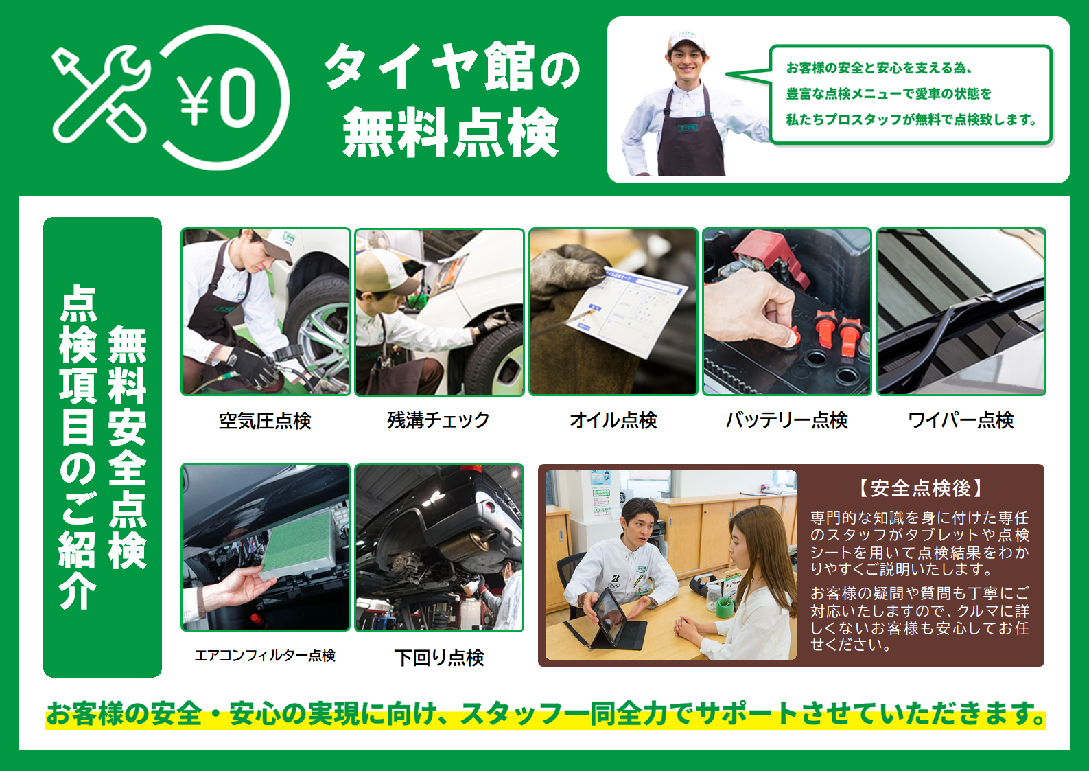 タイヤ館梅坪店の無料安全点検は、Webで作業日時の予約ができます。ご利用ください。