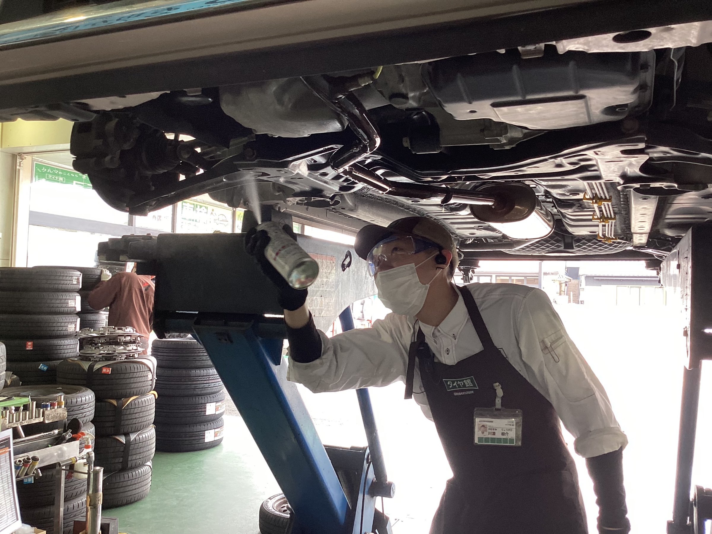 タイヤ館梅坪店では、そんな「サビ」の対策として『防錆(ぼうせい)コーティング』(=防錆コート)(=アンダーコート)という作業をやっています。