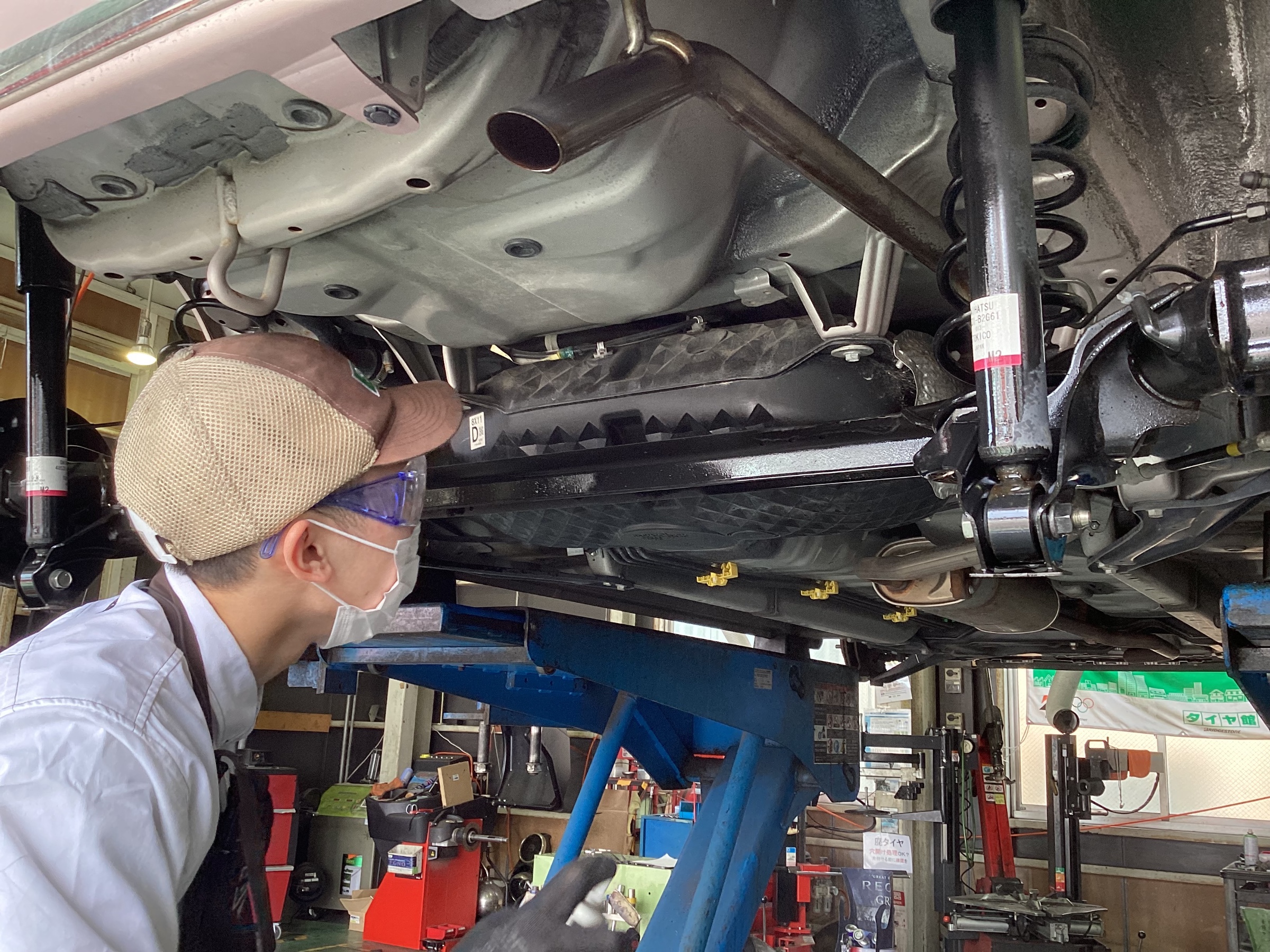 スタッドレスタイヤから夏用タイヤへの履き替え作業と同時にクルマの排気マフラー含む下廻りの「防錆コート」を実施させていただきました。