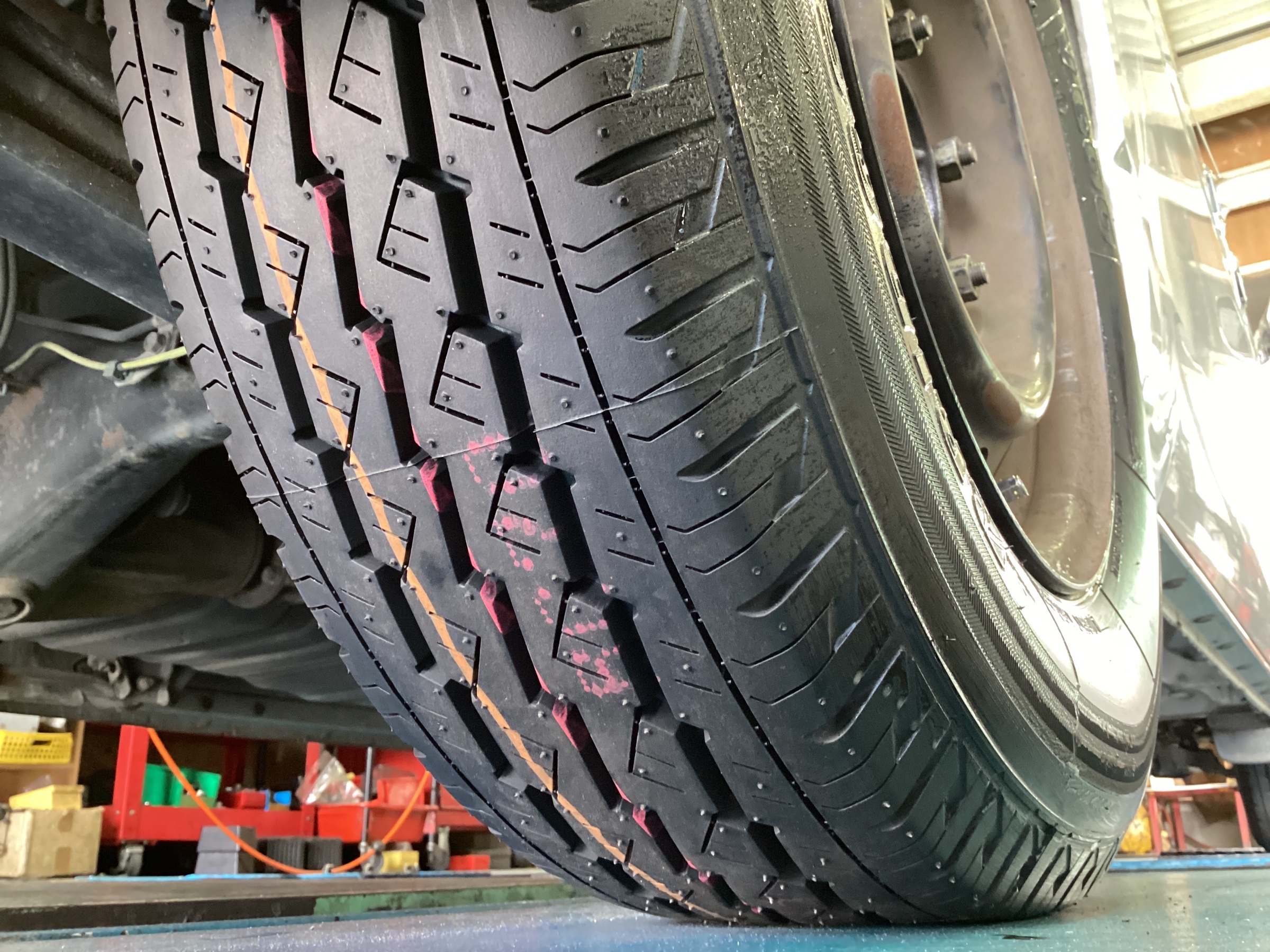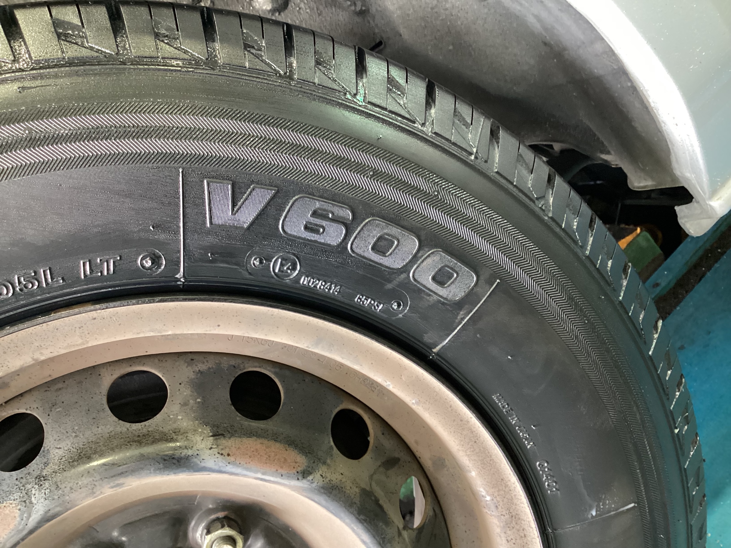 連休中に仕事で使っているハイエースのタイヤ交換作業のご依頼をいただきました。毎日かなりの距離を乗るということで、「高くないタイヤでいいよ」と。「ブリヂストン V600」をご提案させていただきました。