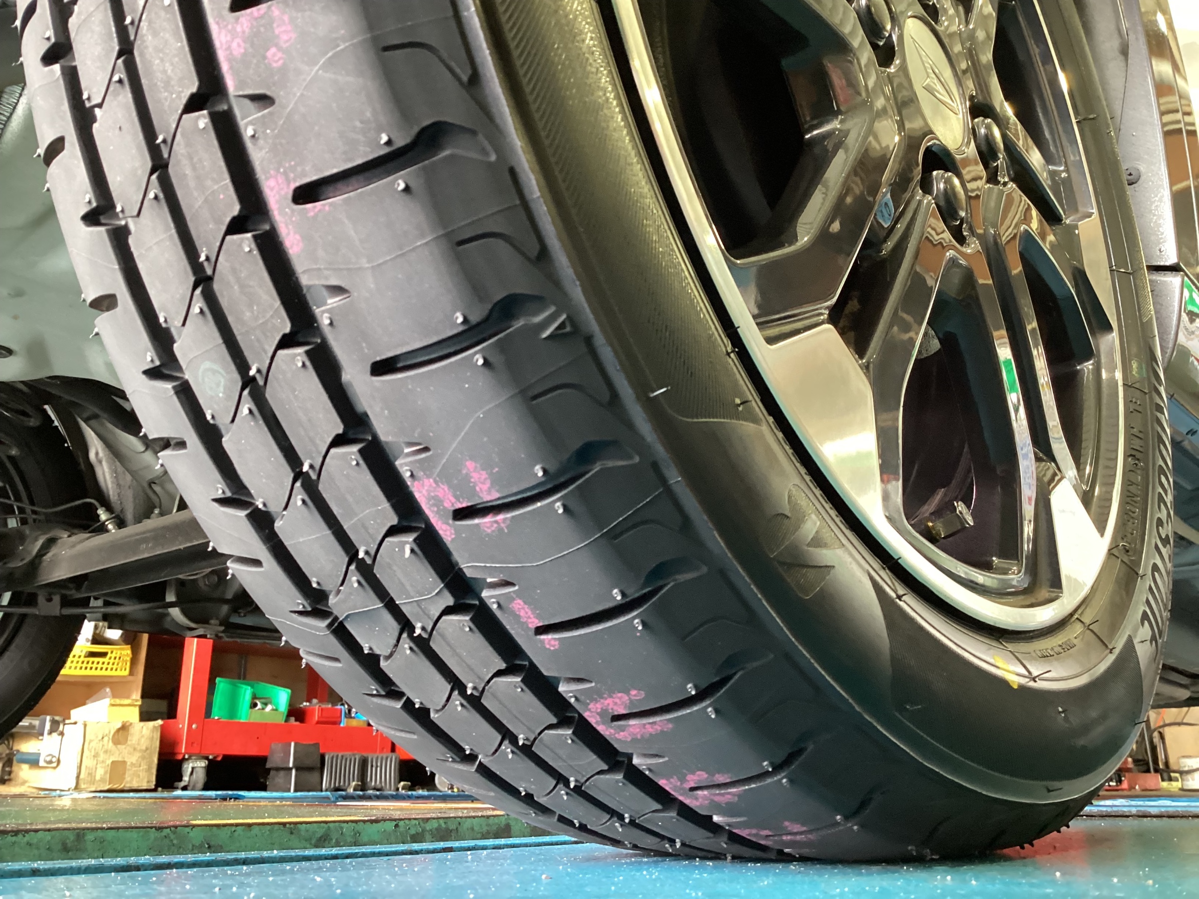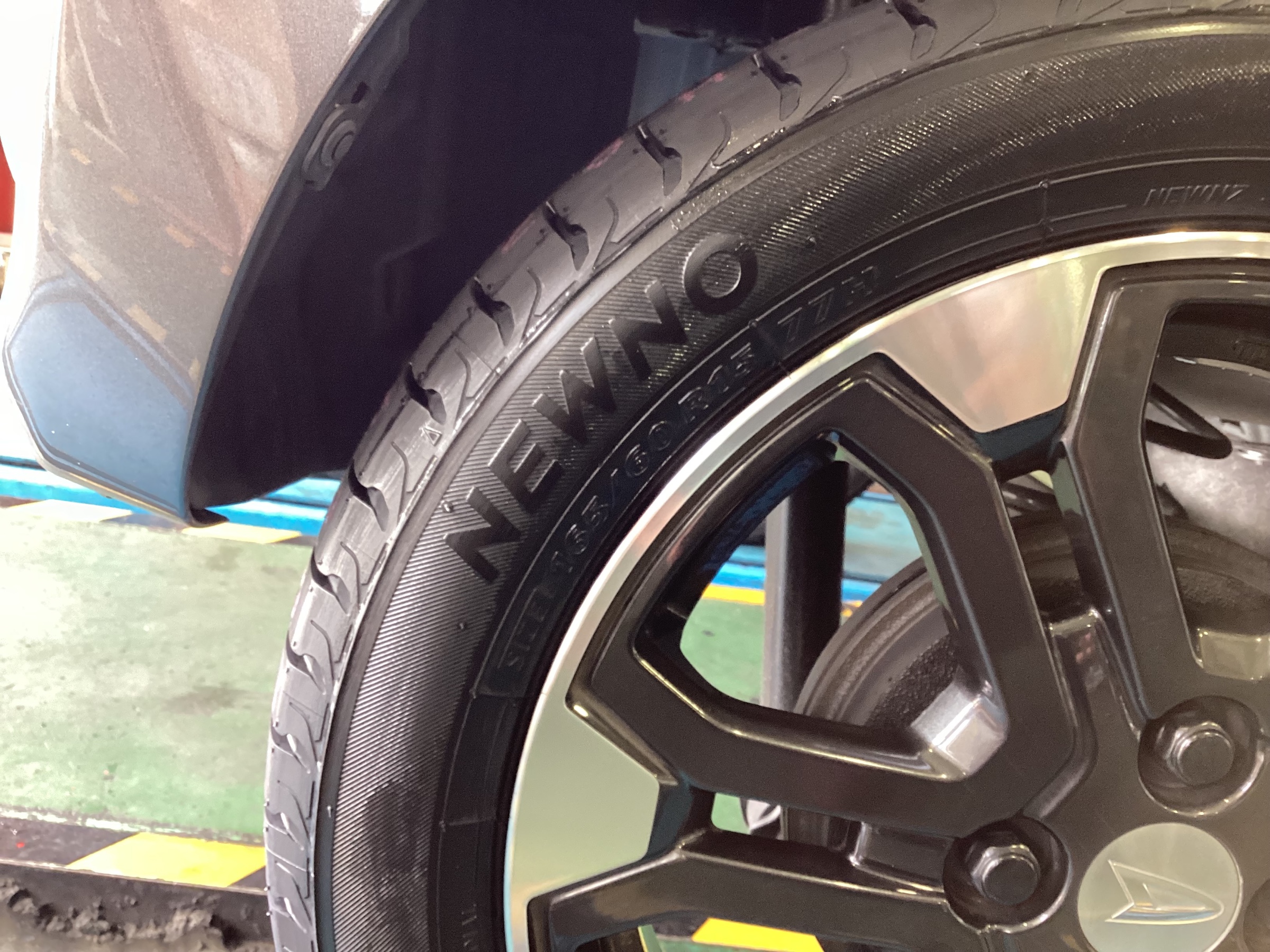 お客様が車検を通そうと工場に車を持ち込んだところ、タイヤが減りすぎて車検が通らないと言われ、急遽、タイヤ交換のご依頼をいただきました。唯一在庫にあった「ブリヂストン NEWNO」に交換です。