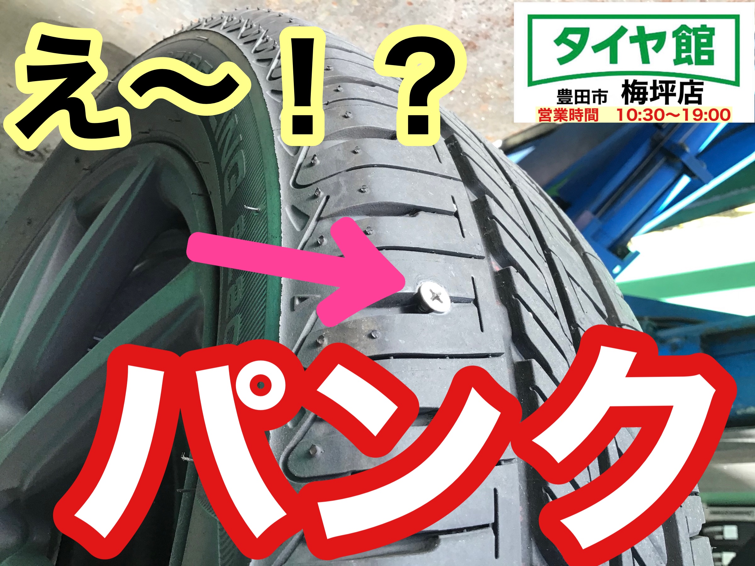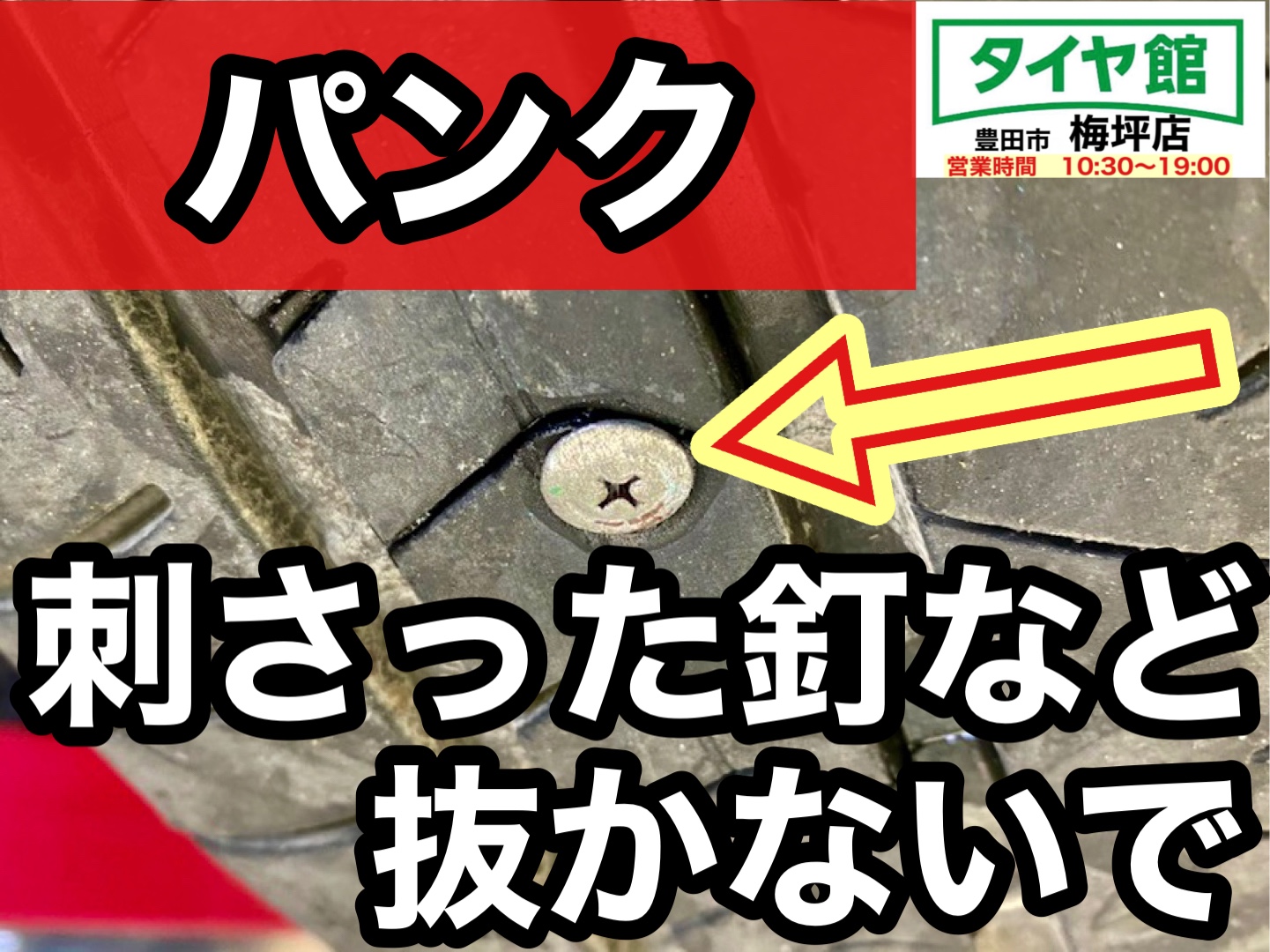 タイヤ館梅坪店では、パンク修理もやってます。タイヤに刺さった釘や異物な抜かずにお持ちください。