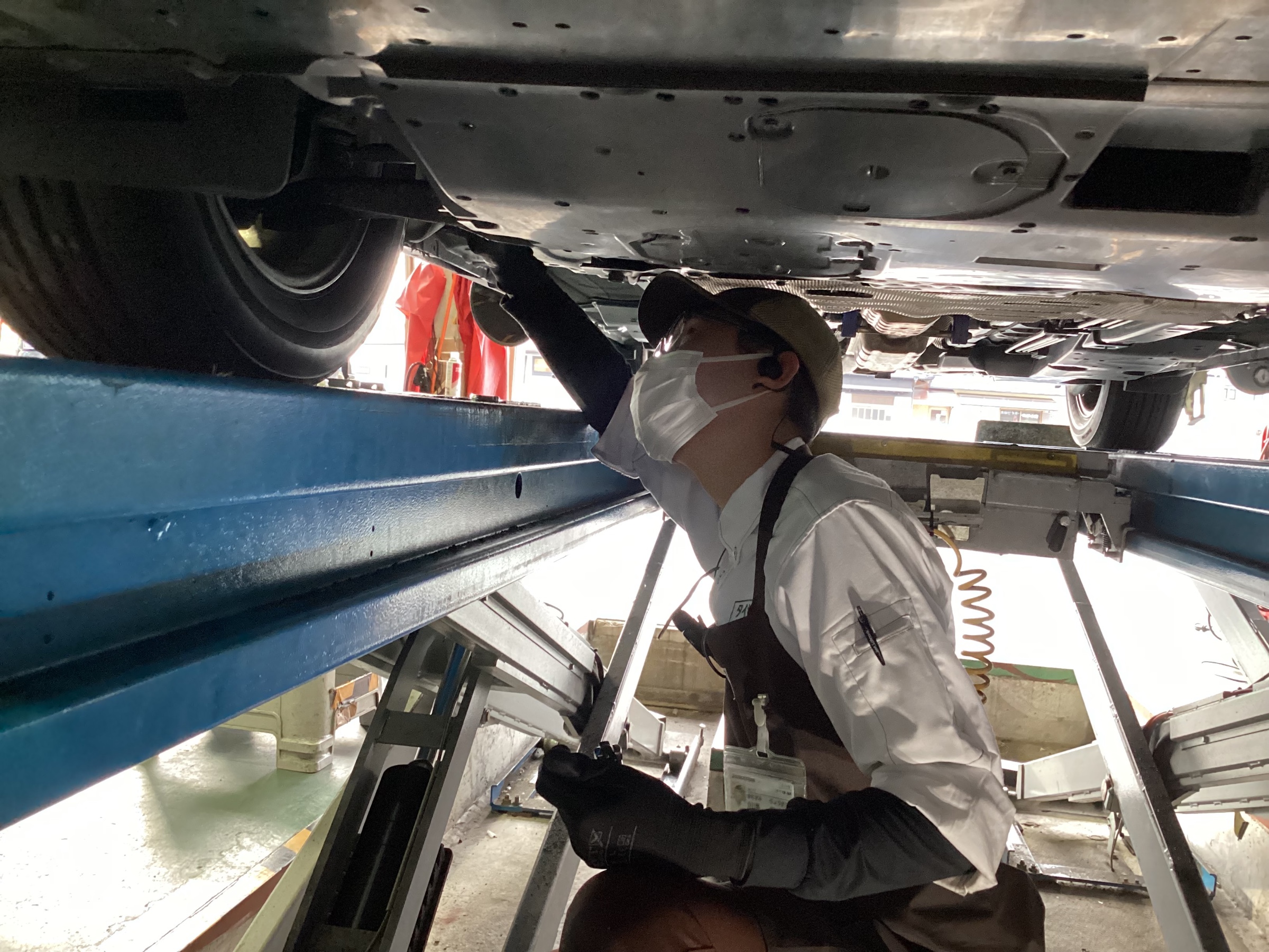 ズレがあった場合、タイヤの早期摩耗や偏摩耗、走行の安定さが欠けたりします。それを緩和するのがアライメント調整作業。熟練スタッフがクルマの下に潜り、最適な数値に戻す調整作業をします。