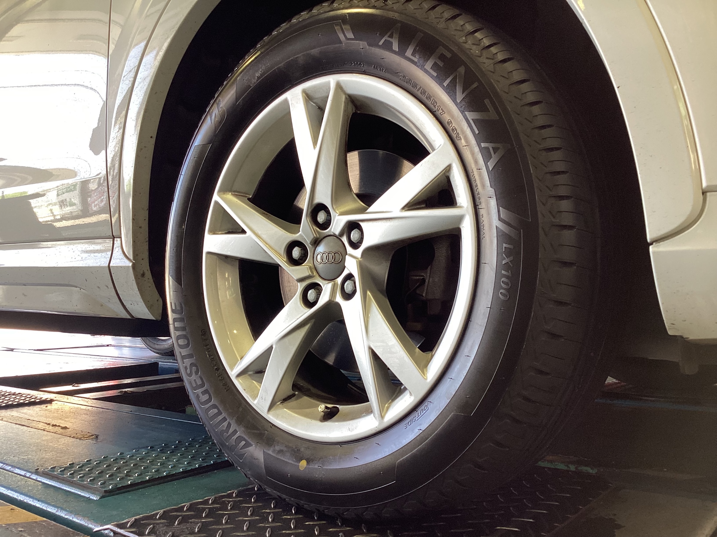 アウディQ3のタイヤ交換です。快適性能に高いタイヤをご希望されていましたので、ブリヂストンのSUV専用タイヤ「ALENZA LX100」をご提案させていただきました。