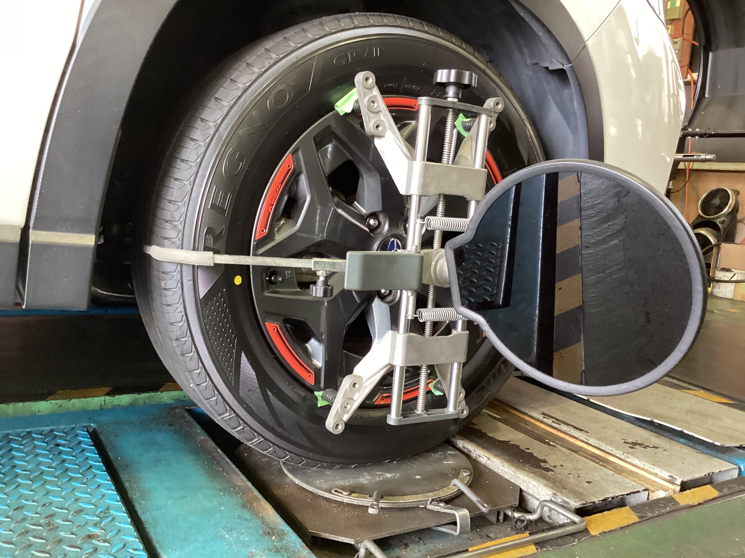 フォレスターのタイヤ・ホイールにセンサーを取り付け、タイヤの取付角度のミリ単位の数値を測ります。その数値が自動車メーカーが定める数値の範囲内かそうでないかをチェックします。