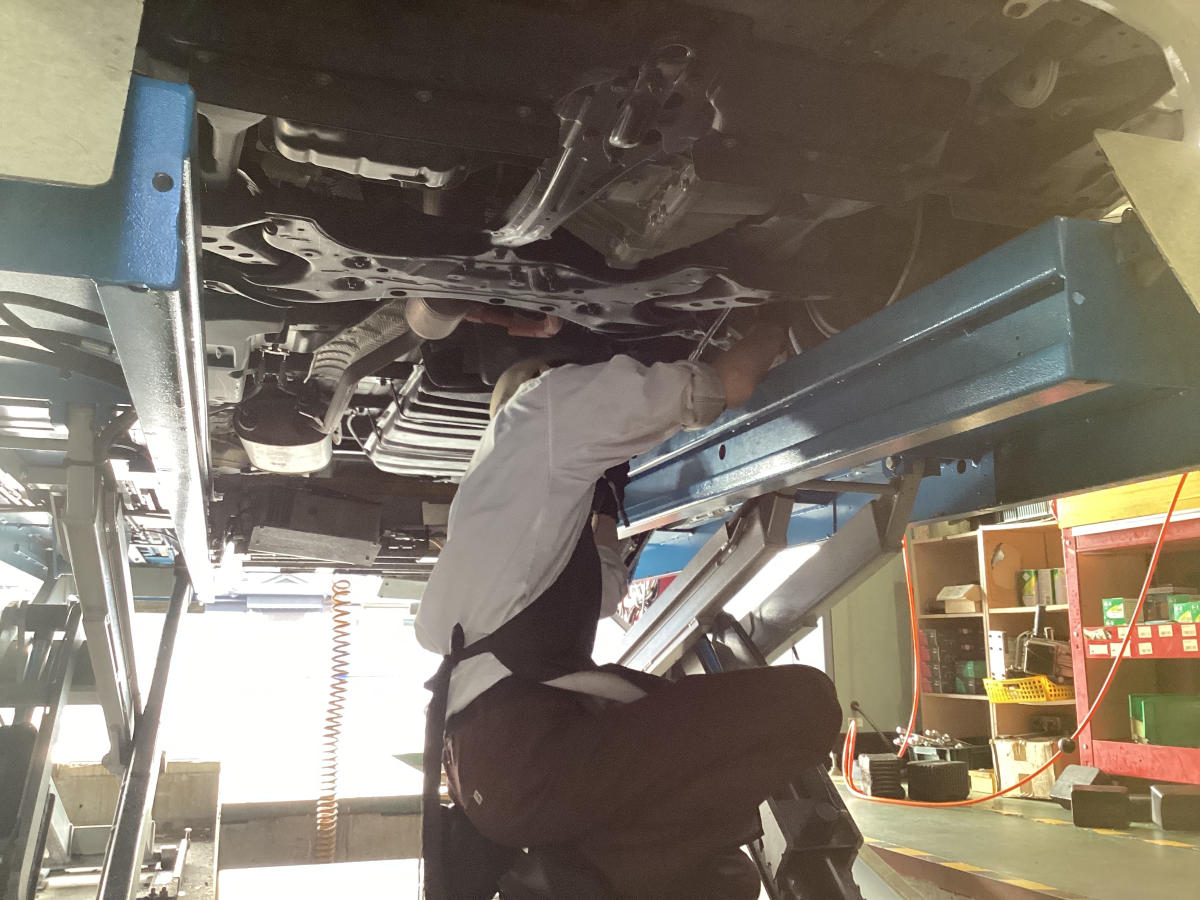 ズレがあった場合、タイヤの早期摩耗や偏摩耗、走行の安定さが欠けたりします。それを緩和するのがアライメント調整作業。熟練スタッフがクルマの下に潜り、最適な数値に戻す調整作業をします。