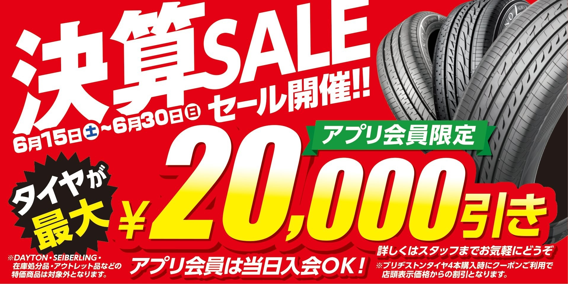 セール期間中にタイヤ館アプリをダウンロードしてブリヂストンタイヤをご購入いただくと、4本で最大20,000円引きとなります。