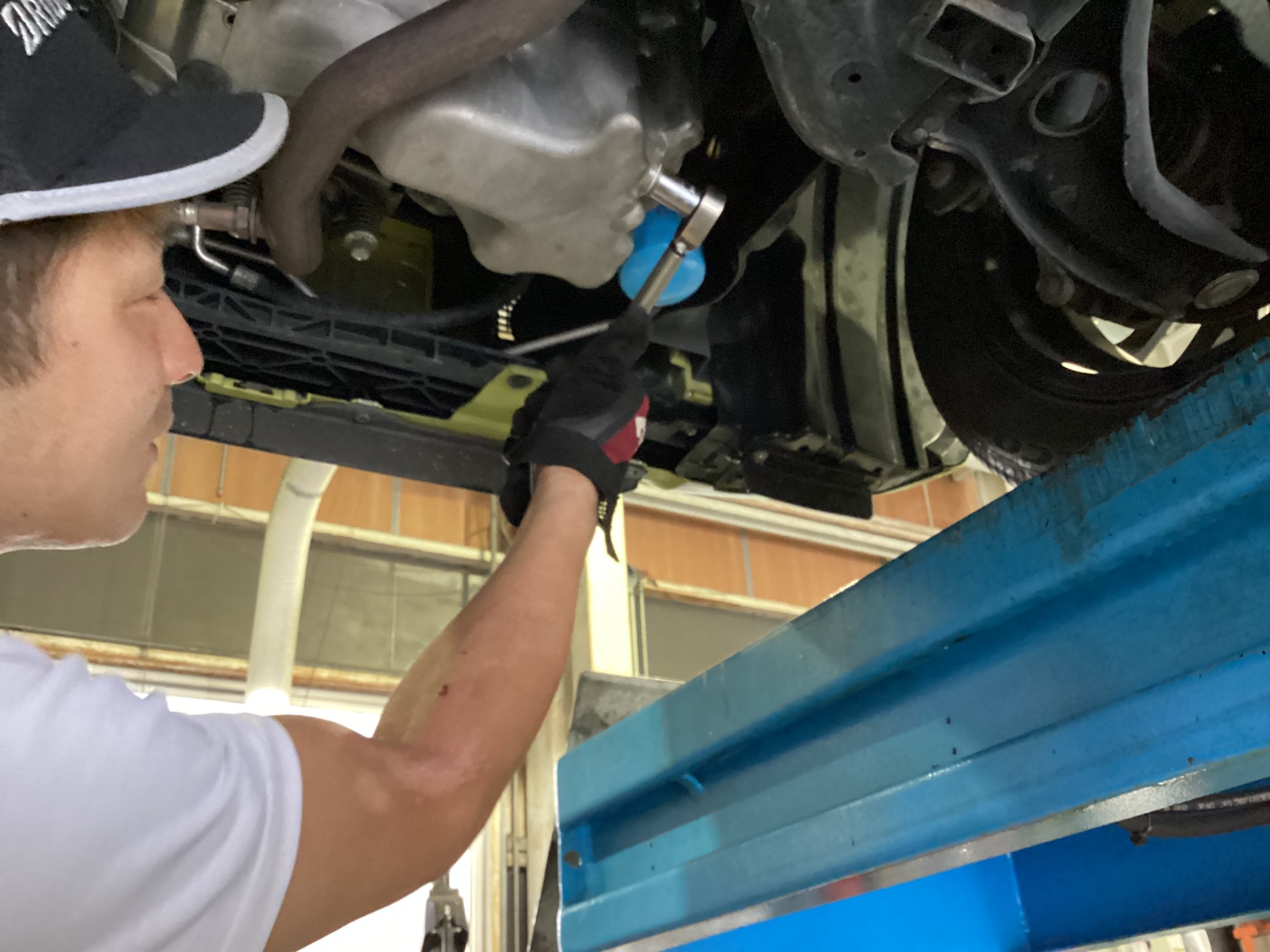 クルマを上げてドレンボルトを抜き使用済みオイルを排出します。そして、使用済みオイルエレメントを外し新品に交換します。