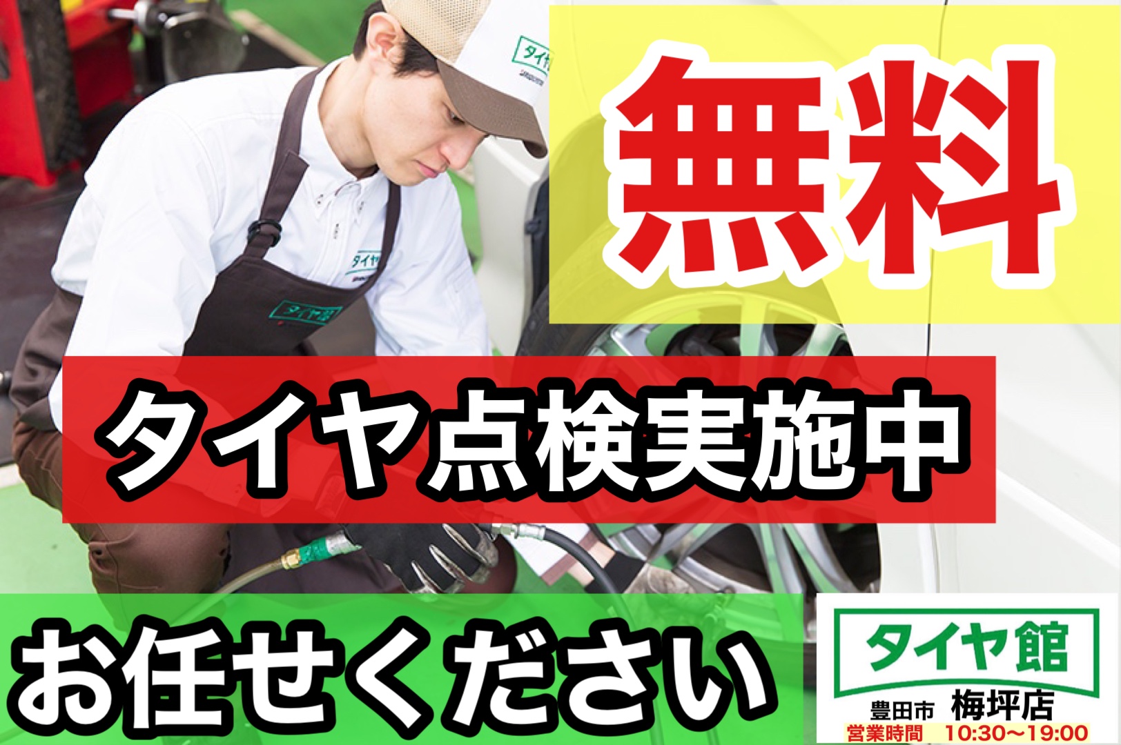 タイヤ館梅坪店では、タイヤの空気圧点検はいつでも無料で実施中です。お気軽にお申し付けください。