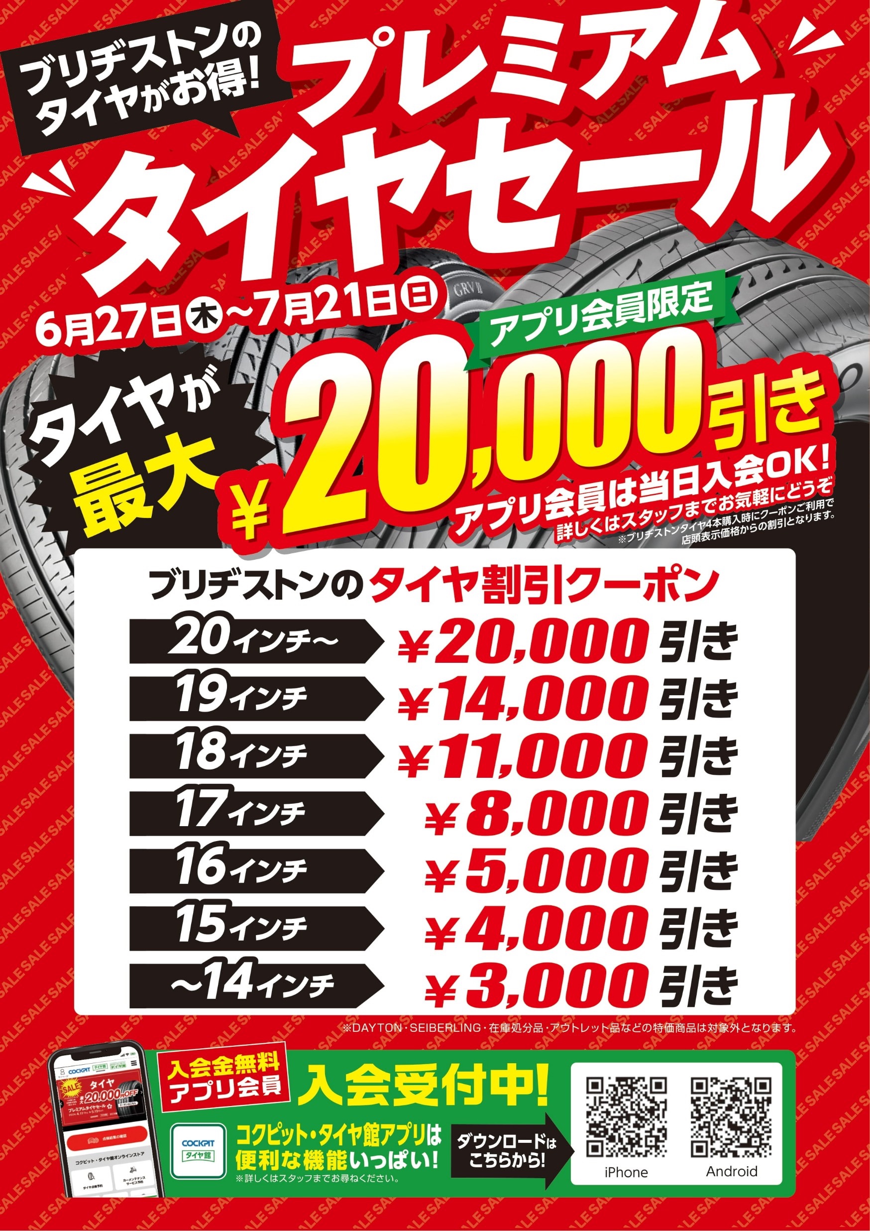 開催中の「プレミアムタイヤセール」ですが、本日が最終日となり、閉店時間は19:00となります。